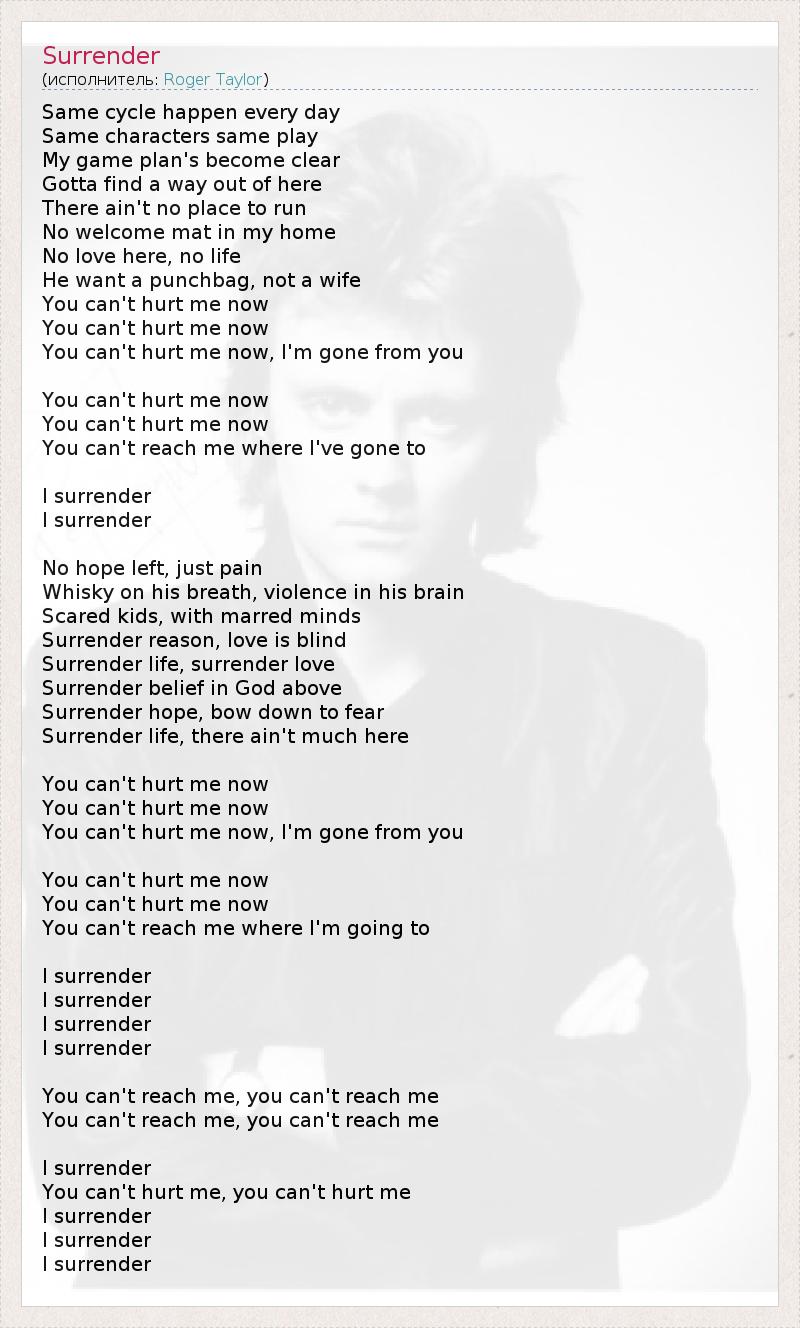 Same cycle happen every day Same characters same play My game plan's become clear Gotta find a way out of here There ain't no place to run No welcome mat in my home No love here, no life He want a punchbag, not a wife You can't hurt me now You can't hurt me now You can't hurt me now, I'm gone from you You can't hurt me now You can't hurt me now You can't reach me where I've gone to I surrender I surrender No hope left, just pain Whisky on his breath, violence in his brain Scared kids, with marred minds Surrender reason, love is blind Surrender life, surrender love Surrender belief in God above Surrender hope, bow down to fear Surrender life, there ain't much here You can't hurt me now You can't hurt me now You can't hurt me now, I'm gone from you You can't hurt me now You can't hurt me now You can't reach me where I'm going to I surrender I surrender I surrender I surrender You can't reach me, you can't reach me You can't reach me, you can't reach me I surrender You can't hurt me, you can't hurt me I surrender I surrender I surrender