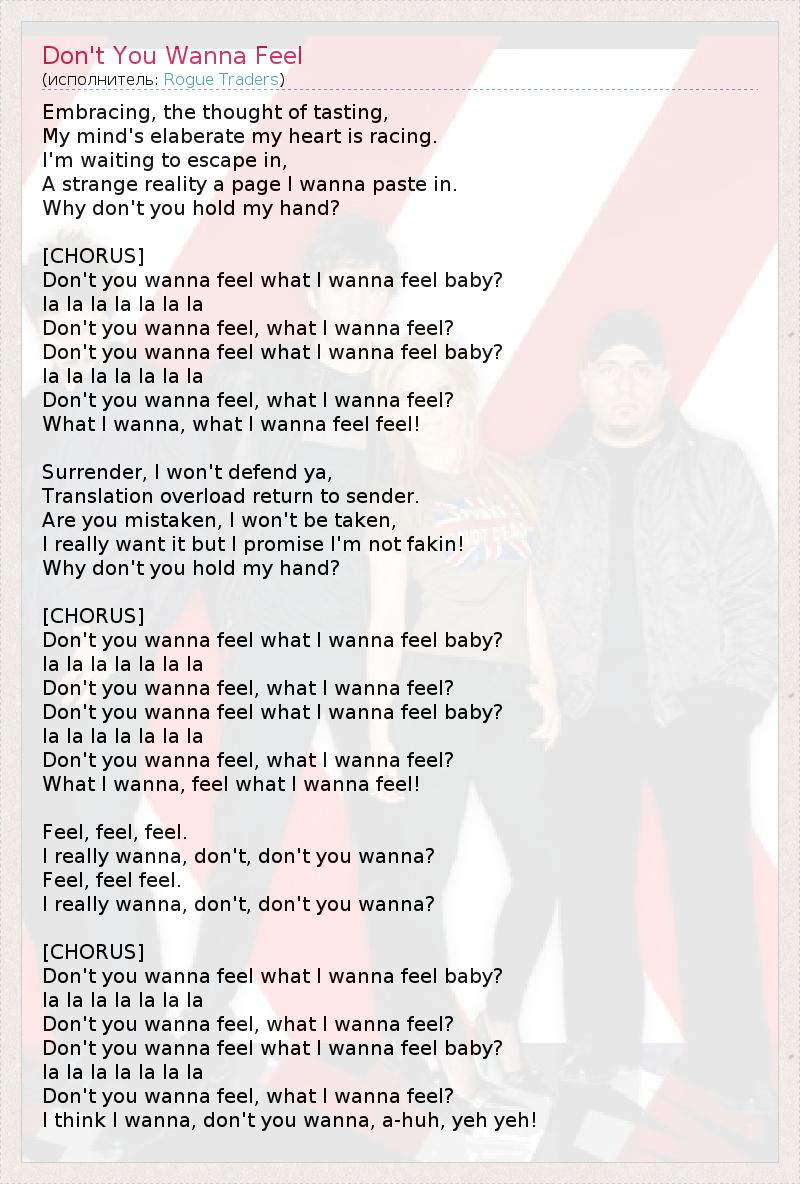 Embracing, the thought of tasting, My mind's elaberate my heart is racing. I'm waiting to escape in, A strange reality a page I wanna paste in. Why don't you hold my hand? [CHORUS] Don't you wanna feel what I wanna feel baby? la la la la la la la Don't you wanna feel, what I wanna feel? Don't you wanna feel what I wanna feel baby? la la la la la la la Don't you wanna feel, what I wanna feel? What I wanna, what I wanna feel feel! Surrender, I won't defend ya, Translation overload return to sender. Are you mistaken, I won't be taken, I really want it but I promise I'm not fakin! Why don't you hold my hand? [CHORUS] Don't you wanna feel what I wanna feel baby? la la la la la la la Don't you wanna feel, what I wanna feel? Don't you wanna feel what I wanna feel baby? la la la la la la la Don't you wanna feel, what I wanna feel? What I wanna, feel what I wanna feel! Feel, feel, feel. I really wanna, don't, don't you wanna? Feel, feel feel. I really wanna, don't, don't you wanna? [CHORUS] Don't you wanna feel what I wanna feel baby? la la la la la la la Don't you wanna feel, what I wanna feel? Don't you wanna feel what I wanna feel baby? la la la la la la la Don't you wanna feel, what I wanna feel? I think I wanna, don't you wanna, a-huh, yeh yeh!
