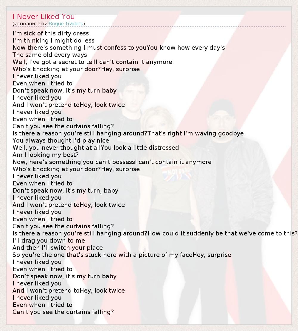 I'm sick of this dirty dress I'm thinking I might do less Now there's something I must confess to youYou know how every day's The same old every ways Well, I've got a secret to tellI can't contain it anymore Who's knocking at your door?Hey, surprise I never liked you Even when I tried to Don't speak now, it's my turn baby I never liked you And I won't pretend toHey, look twice I never liked you Even when I tried to Can't you see the curtains falling? Is there a reason you're still hanging around?That's right I'm waving goodbye You always thought I'd play nice Well, you never thought at allYou look a little distressed Am I looking my best? Now, here's something you can't possessI can't contain it anymore Who's knocking at your door?Hey, surprise I never liked you Even when I tried to Don't speak now, it's my turn, baby I never liked you And I won't pretend toHey, look twice I never liked you Even when I tried to Can't you see the curtains falling? Is there a reason you're still hanging around?How could it suddenly be that we've come to this? I'll drag you down to me And then I'll switch your place So you're the one that's stuck here with a picture of my faceHey, surprise I never liked you Even when I tried to Don't speak now, it's my turn baby I never liked you And I won't pretend toHey, look twice I never liked you Even when I tried to Can't you see the curtains falling?