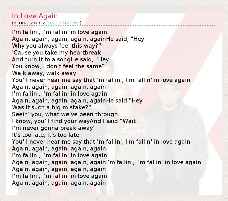I'm fallin', I'm fallin' in love again Again, again, again, again, againHe said, "Hey Why you always feel this way?" 'Cause you take my heartbreak And turn it to a songHe said, "Hey You know, I don't feel the same" Walk away, walk away You'll never hear me say thatI'm fallin', I'm fallin' in love again Again, again, again, again, again I'm fallin', I'm fallin' in love again Again, again, again, again, againHe said "Hey Was it such a big mistake?" Seein' you, what we've been through I know, you'll find your wayAnd I said "Wait I'm never gonna break away" It's too late, it's too late You'll never hear me say thatI'm fallin', I'm fallin' in love again Again, again, again, again, again I'm fallin', I'm fallin' in love again Again, again, again, again, againI'm fallin', I'm fallin' in love again Again, again, again, again, again I'm fallin', I'm fallin' in love again Again, again, again, again, again