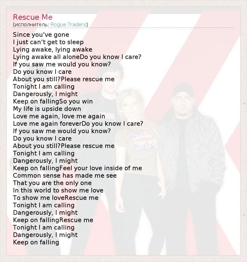 Since you've gone I just can't get to sleep Lying awake, lying awake Lying awake all aloneDo you know I care? If you saw me would you know? Do you know I care About you still?Please rescue me Tonight I am calling Dangerously, I might Keep on fallingSo you win My life is upside down Love me again, love me again Love me again foreverDo you know I care? If you saw me would you know? Do you know I care About you still?Please rescue me Tonight I am calling Dangerously, I might Keep on fallingFeel your love inside of me Common sense has made me see That you are the only one In this world to show me love To show me loveRescue me Tonight I am calling Dangerously, I might Keep on fallingRescue me Tonight I am calling Dangerously, I might Keep on falling