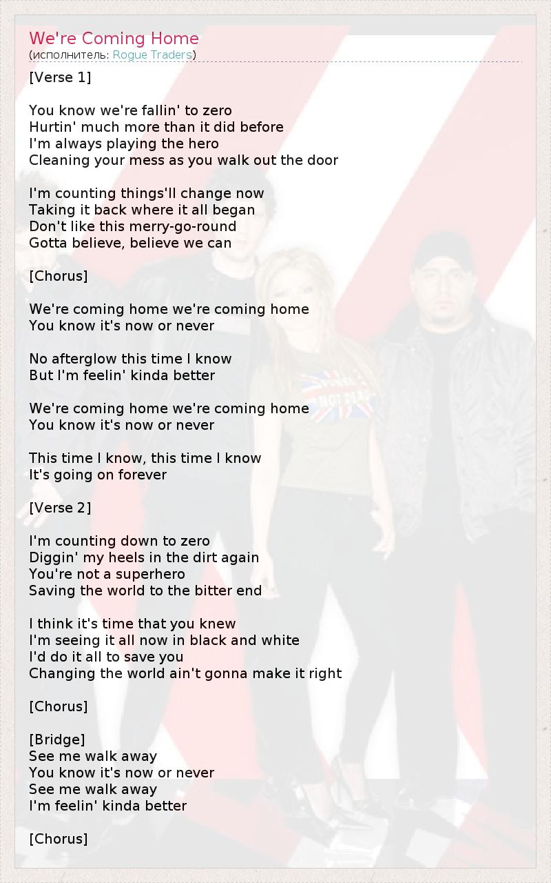 [Verse 1] You know we're fallin' to zero Hurtin' much more than it did before I'm always playing the hero Cleaning your mess as you walk out the door I'm counting things'll change now Taking it back where it all began Don't like this merry-go-round Gotta believe, believe we can [Chorus] We're coming home we're coming home You know it's now or never No afterglow this time I know But I'm feelin' kinda better We're coming home we're coming home You know it's now or never This time I know, this time I know It's going on forever [Verse 2] I'm counting down to zero Diggin' my heels in the dirt again You're not a superhero Saving the world to the bitter end I think it's time that you knew I'm seeing it all now in black and white I'd do it all to save you Changing the world ain't gonna make it right [Chorus] [Bridge] See me walk away You know it's now or never See me walk away I'm feelin' kinda better [Chorus]