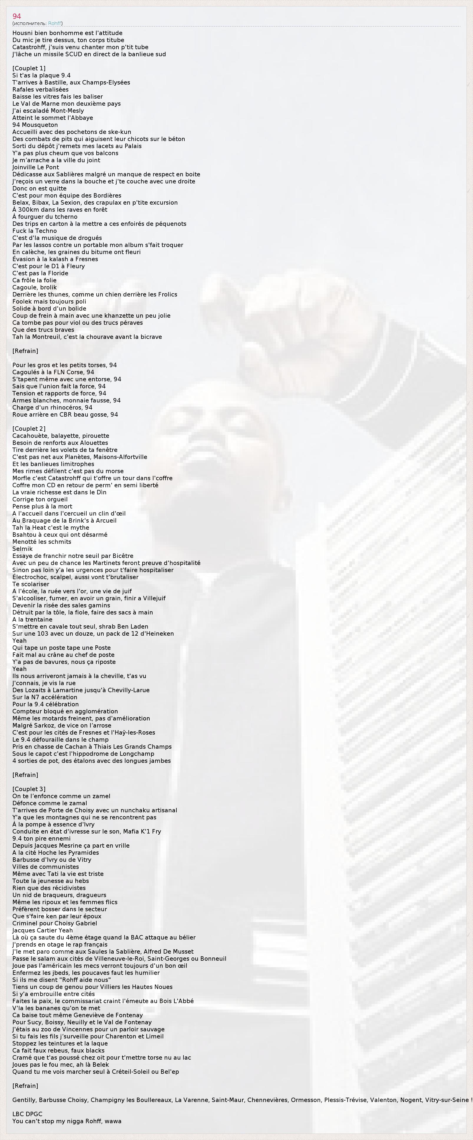 Это интересно:Плохой мальчик парижских предместий. Когда-то он был частью значимой для французской сцены тусовки Mafia k'1 Fry, но их пути разошлись, а сольное творчество Rohff от этого только выиграло. Его музыка, как и музыка Мафии, по большей части являет собой французский тип гангста рэпа, со всеми присущими атрибутами. Если сравнивать французский и американский образцы этого жанра, то французский видится... продолжение
