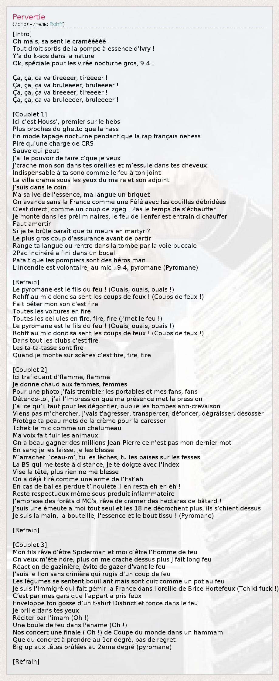 [Intro] Oh mais, sa sent le cramééééé ! Tout droit sortis de la pompe à essence d'Ivry ! Y'a du k-sos dans la nature Ok, spéciale pour les virée nocturne gros, 9.4 ! Ça, ça, ça va tireeeer, tireeeer ! Ça, ça, ça va bruleeeer, bruleeeer ! Ça, ça, ça va tireeeer, tireeeer ! Ça, ça, ça va bruleeeer, bruleeeer ! [Couplet 1] Ici c'est Houss', premier sur le hebs Plus proches du ghetto que la hass En mode tapage nocturne pendant que la rap français nehess Pire qu'une charge de CRS Sauve qui peut J'ai le pouvoir de faire c'que je veux J'crache mon son dans tes oreilles et m’essuie dans tes cheveux Indispensable à ta sono comme le feu à ton joint La ville crame sous les yeux du maire et son adjoint J'suis dans le coin Ma salive de l'essence, ma langue un briquet On avance sans la France comme une Féfé avec les couilles débridées C'est direct, comme un coup de zgeg : Pas le temps de s'échauffer Je monte dans les préliminaires, le feu de l'enfer est entrain d'chauffer Faut amortir Si je te brûle paraît que tu meurs en martyr ? Le plus gros coup d'assurance avant de partir Range ta langue ou rentre dans la tombe par la voie buccale 2Pac incinéré a fini dans un bocal Parait que les pompiers sont des héros man L'incendie est volontaire, au mic : 9.4, pyromane (Pyromane) [Refrain] Le pyromane est le fils du feu ! (Ouais, ouais, ouais !) Rohff au mic donc sa sent les coups de feux ! (Coups de feux !) Fait péter mon son c'est fire Toutes les voitures en fire Toutes les cellules en fire, fire, fire (J'met le feu !) Le pyromane est le fils du feu ! (Ouais, ouais, ouais !) Rohff au mic donc sa sent les coups de feux ! (Coups de feux !) Dans tout les clubs c'est fire Les ta-ta-tasse sont fire Quand je monte sur scènes c'est fire, fire, fire [Couplet 2] Ici trafiquant d’flamme, flamme Je donne chaud aux femmes, femmes Pour une photo j'fais trembler les portables et mes fans, fans Détends-toi, j'ai l'impression que ma présence met la pression J'ai ce qu'il faut pour les dégonfler, oublie les bombes anti-crevaison Viens pas m'chercher, j'vais t'agresser, transpercer, défoncer, dégraisser, désosser Protège ta peau mets de la crème pour la caresser Tchek le mic comme un chalumeau Ma voix fait fuir les animaux On a beau gagner des millions Jean-Pierre ce n'est pas mon dernier mot En sang je les laisse, je les blesse M'arracher l'ceau-m', tu les lèches, tu les baises sur les fesses La BS qui me teste à distance, je te doigte avec l'index Vise la tête, plus rien ne me blesse On a déjà tiré comme une arme de l'Est'ah En cas de balles perdue t’inquiète il en resta eh eh eh ! Reste respectueux même sous produit inflammatoire J'embrase des forêts d'MC's, rêve de cramer des hectares de bâtard ! J'suis une émeute a moi tout seul et les 18 ne décrochent plus, ils s'chient dessus Je suis la main, la bouteille, l'essence et le bout tissu ! (Pyromane) [Refrain] [Couplet 3] Mon fils rêve d'être Spiderman et moi d'être l'Homme de feu On veux m'éteindre, plus on me crache dessus plus j'fait long feu Réaction de gazinière, évite de gazer d'vant le feu J'suis le lion sans crinière qui rugis d'un coup de feu Les légumes se sentent bouillant mais sont cuit comme un pot au feu Je suis l'immigré qui fait gémir la France dans l'oreille de Brice Hortefeux (Tchiki fuck !) C’est par mes gars que l'appart a pris feux Enveloppe ton gosse d'un t-shirt Distinct et fonce dans le feu Je brille dans tes yeux Réciter par l'imam (Oh !) Une boule de feu dans Paname (Oh !) Nos concert une finale ( Oh !) de Coupe du monde dans un hammam Que du concret à prendre au 1er degré, pas de regret Big up aux têtes brûlées au 2eme degré (pyromane) [Refrain]
