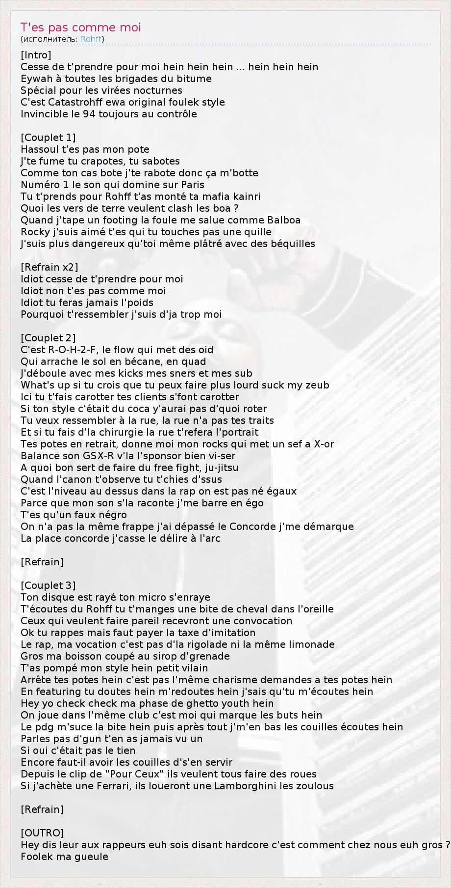 Это интересно:Плохой мальчик парижских предместий. Когда-то он был частью значимой для французской сцены тусовки Mafia k'1 Fry, но их пути разошлись, а сольное творчество Rohff от этого только выиграло. Его музыка, как и музыка Мафии, по большей части являет собой французский тип гангста рэпа, со всеми присущими атрибутами. Если сравнивать французский и американский образцы этого жанра, то французский видится... продолжение