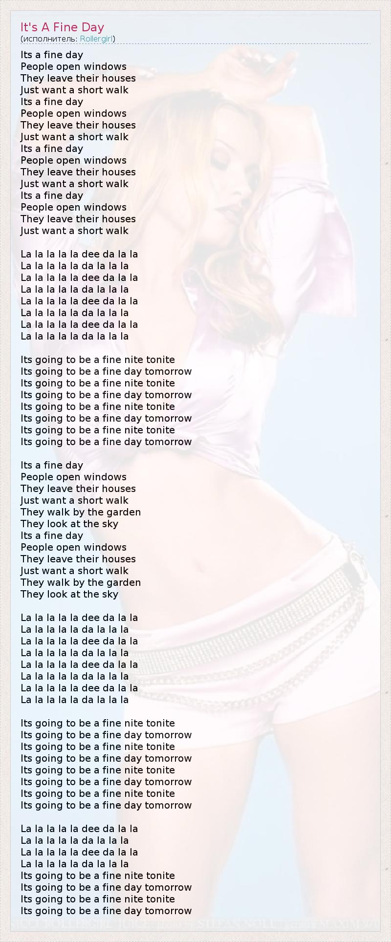 Это прекрасный день Это прекрасный день, Люди открывают окна, Покидают свои дома, Желая немного прогуляться. [*4] Ла ла ла ла ла ди да ла ла Ла ла ла ла ла да ла ла ла [*4] Ночь сегодня собирается быть прекрасной, День завтрашний собирается быть прекрасным. [*4] Это прекрасный день, Люди открывают окна, Покидают свои дома, Желая немного прогуляться. Они гуляют по саду, Они смотрят на небо. [*2] Ла ла ла ла ла ди да ла ла Ла ла ла ла ла да ла ла ла [*4] Ночь сегодня собирается быть прекрасной, День завтрашний собирается быть прекрасным. [*4] Ла ла ла ла ла ди да ла ла Ла ла ла ла ла да ла ла ла [*2] Ночь сегодня собирается быть прекрасной, День завтрашний собирается быть прекрасным. [*2]