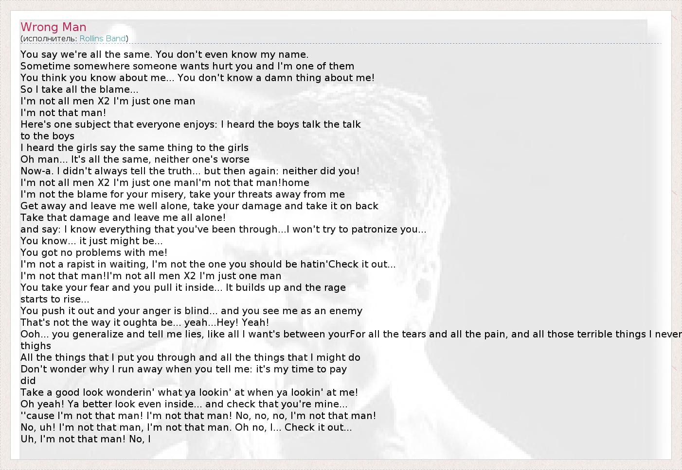 You say we're all the same. You don't even know my name. Sometime somewhere someone wants hurt you and I'm one of them You think you know about me... You don't know a damn thing about me! So I take all the blame... I'm not all men X2 I'm just one man I'm not that man! Here's one subject that everyone enjoys: I heard the boys talk the talk to the boys I heard the girls say the same thing to the girls Oh man... It's all the same, neither one's worse Now-a. I didn't always tell the truth... but then again: neither did you! I'm not all men X2 I'm just one manI'm not that man!home I'm not the blame for your misery, take your threats away from me Get away and leave me well alone, take your damage and take it on back Take that damage and leave me all alone! and say: I know everything that you've been through...I won't try to patronize you... You know... it just might be... You got no problems with me! I'm not a rapist in waiting, I'm not the one you should be hatin'Check it out... I'm not that man!I'm not all men X2 I'm just one man You take your fear and you pull it inside... It builds up and the rage starts to rise... You push it out and your anger is blind... and you see me as an enemy That's not the way it oughta be... yeah...Hey! Yeah! Ooh... you generalize and tell me lies, like all I want's between yourFor all the tears and all the pain, and all those terrible things I never thighs All the things that I put you through and all the things that I might do Don't wonder why I run away when you tell me: it's my time to pay did Take a good look wonderin' what ya lookin' at when ya lookin' at me! Oh yeah! Ya better look even inside... and check that you're mine... ''cause I'm not that man! I'm not that man! No, no, no, I'm not that man! No, uh! I'm not that man, I'm not that man. Oh no, I... Check it out... Uh, I'm not that man! No, I
