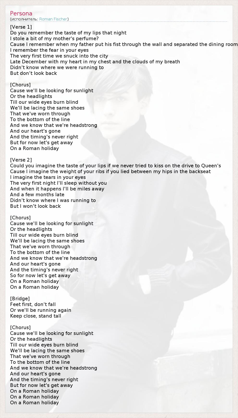 [Куплет 1:] Ты помнишь вкус моих губ в ту ночь, Когда я украла немножко маминых духов? Потому что я помню, как мой отец ударил кулаком и проломил стену в столовой, Я помню страх в твоих глазах, Когда мы сбежали в город в самый первый раз. Это был конец декабря; Мое сердце застряло в груди и мое дыхание становилось облаком. Мы не знаем, куда мы идем, Но не оглядывайся назад. [Припев:] Потому что мы пойдем за солнечным лучом, Или светом фар, Пока наши глаза не заболят от ожогов. Мы будем завязывать шнурки на тех же ботинках, В которых мы ходили На край света. И мы знаем, что наше упрямство не знает границ, И наши сердца не подчиняются нам, И время никогда не играет в нашу пользу, Но прямо сейчас, давай сбежим И устроим себе Римские каникулы. [Куплет 2:] Какой был бы вкус у твоих губ, если бы мы никогда не целовались по дороге в Куинс? Потому что я могу представить себе тяжесть твоих ребер, если бы ты лег между моих бедер на заднем сиденье. Я представляю слезы в твоих глазах, В самую первую ночь, когда ты спал без меня. И когда это произойдет, я буду так далеко от тебя. И пару месяцев назад, Я не знала, куда я бегу, Но я не оглядывалась назад. [Припев:] Потому что мы пойдем за солнечным лучом, Или светом фар, Пока наши глаза не заболят ожогов. Мы будем завязывать шнурки на тех же ботинках, В которых мы ходили На край света. И мы знаем, что наше упрямство не знает границ, И наши сердца не подчиняются нам, И время никогда не играет в нашу пользу, Но прямо сейчас, давай сбежим И устроим себе Римские каникулы. Римские каникулы. [Переход:] Крепко стой на ногах, смотри не упади, Или мы убежим снова. Держись рядом, стой прямо. [Припев:] Потому что мы пойдем за солнечным лучом, Или светом фар, Пока наши глаза не заболят ожогов. Мы будем завязывать шнурки на тех же ботинках, В которых мы ходили На край света. И мы знаем, что наше упрямство не знает границ, И наши сердца не подчиняются нам, И время никогда не играет в нашу пользу, Но прямо сейчас, давай сбежим И устроим себе Римские каникулы. Римские каникулы, Римские каникулы.