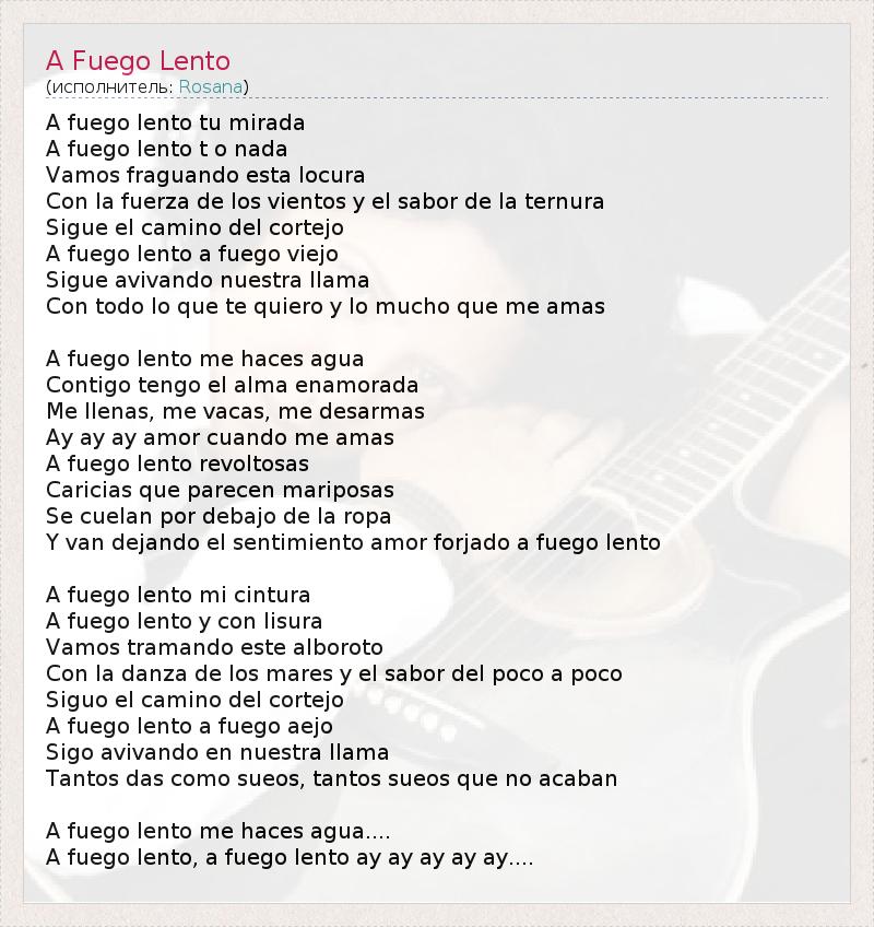 A fuego lento tu mirada A fuego lento t o nada Vamos fraguando esta locura Con la fuerza de los vientos y el sabor de la ternura Sigue el camino del cortejo A fuego lento a fuego viejo Sigue avivando nuestra llama Con todo lo que te quiero y lo mucho que me amas A fuego lento me haces agua Contigo tengo el alma enamorada Me llenas, me vacas, me desarmas Ay ay ay amor cuando me amas A fuego lento revoltosas Caricias que parecen mariposas Se cuelan por debajo de la ropa Y van dejando el sentimiento amor forjado a fuego lento A fuego lento mi cintura A fuego lento y con lisura Vamos tramando este alboroto Con la danza de los mares y el sabor del poco a poco Siguo el camino del cortejo A fuego lento a fuego aejo Sigo avivando en nuestra llama Tantos das como sueos, tantos sueos que no acaban A fuego lento me haces agua.... A fuego lento, a fuego lento ay ay ay ay ay....