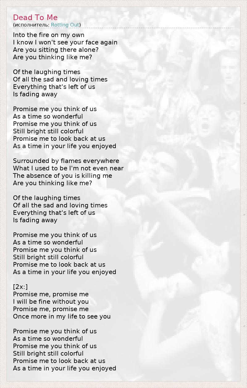 Сгорая изнутри, Я знаю, что не увижу тебя снова. Ты сейчас одна И думаешь о том же? И времена веселья, И грусти, и любви времена - Всё, что осталось от нас, Исчезает. Обещай мне думать о нас, О том, как было прекрасно. Обещай мне думать о нас, Так же ярко и красочно. Обещай мне оглянуться назад, На то время, когда ты наслаждалась жизнью. Языки пламени окружают Образ прежнего меня, хотя я сам далеко... Меня убивает то, что тебя нет рядом. Думаешь ли ты о том же? И времена веселья, И грусти, и любви времена - Всё, что осталось от нас, Исчезает. Обещай мне думать о нас, О том, как было прекрасно. Обещай мне думать о нас, Так же ярко и красочно. Обещай мне оглянуться назад, На то время, когда ты наслаждалась жизнью. [2 раза:] Обещай мне, обещай мне. Мне будет хорошо без тебя. Обещай мне, обещай мне. Ещё раз в жизни увидеть тебя. Обещай мне думать о нас, О том, как было прекрасно. Обещай мне думать о нас, Так же ярко и красочно. Обещай мне оглянуться назад, На то время, когда ты наслаждалась жизнью.