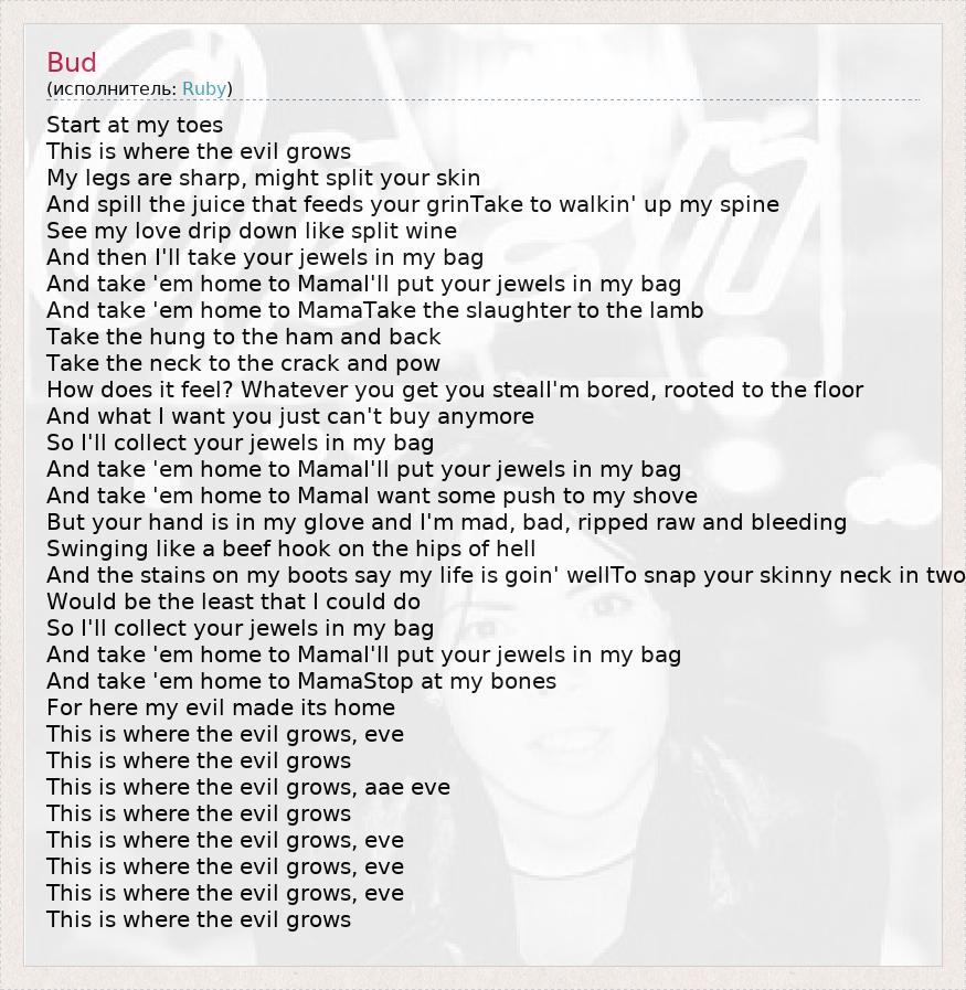 Start at my toes This is where the evil grows My legs are sharp, might split your skin And spill the juice that feeds your grinTake to walkin' up my spine See my love drip down like split wine And then I'll take your jewels in my bag And take 'em home to MamaI'll put your jewels in my bag And take 'em home to MamaTake the slaughter to the lamb Take the hung to the ham and back Take the neck to the crack and pow How does it feel? Whatever you get you stealI'm bored, rooted to the floor And what I want you just can't buy anymore So I'll collect your jewels in my bag And take 'em home to MamaI'll put your jewels in my bag And take 'em home to MamaI want some push to my shove But your hand is in my glove and I'm mad, bad, ripped raw and bleeding Swinging like a beef hook on the hips of hell And the stains on my boots say my life is goin' wellTo snap your skinny neck in two Would be the least that I could do So I'll collect your jewels in my bag And take 'em home to MamaI'll put your jewels in my bag And take 'em home to MamaStop at my bones For here my evil made its home This is where the evil grows, eve This is where the evil grows This is where the evil grows, aae eve This is where the evil grows This is where the evil grows, eve This is where the evil grows, eve This is where the evil grows, eve This is where the evil grows