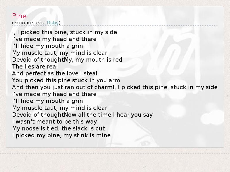 I, I picked this pine, stuck in my side I've made my head and there I'll hide my mouth a grin My muscle taut, my mind is clear Devoid of thoughtMy, my mouth is red The lies are real And perfect as the love I steal You picked this pine stuck in you arm And then you just ran out of charmI, I picked this pine, stuck in my side I've made my head and there I'll hide my mouth a grin My muscle taut, my mind is clear Devoid of thoughtNow all the time I hear you say I wasn't meant to be this way My noose is tied, the slack is cut I picked my pine, my stink is mine