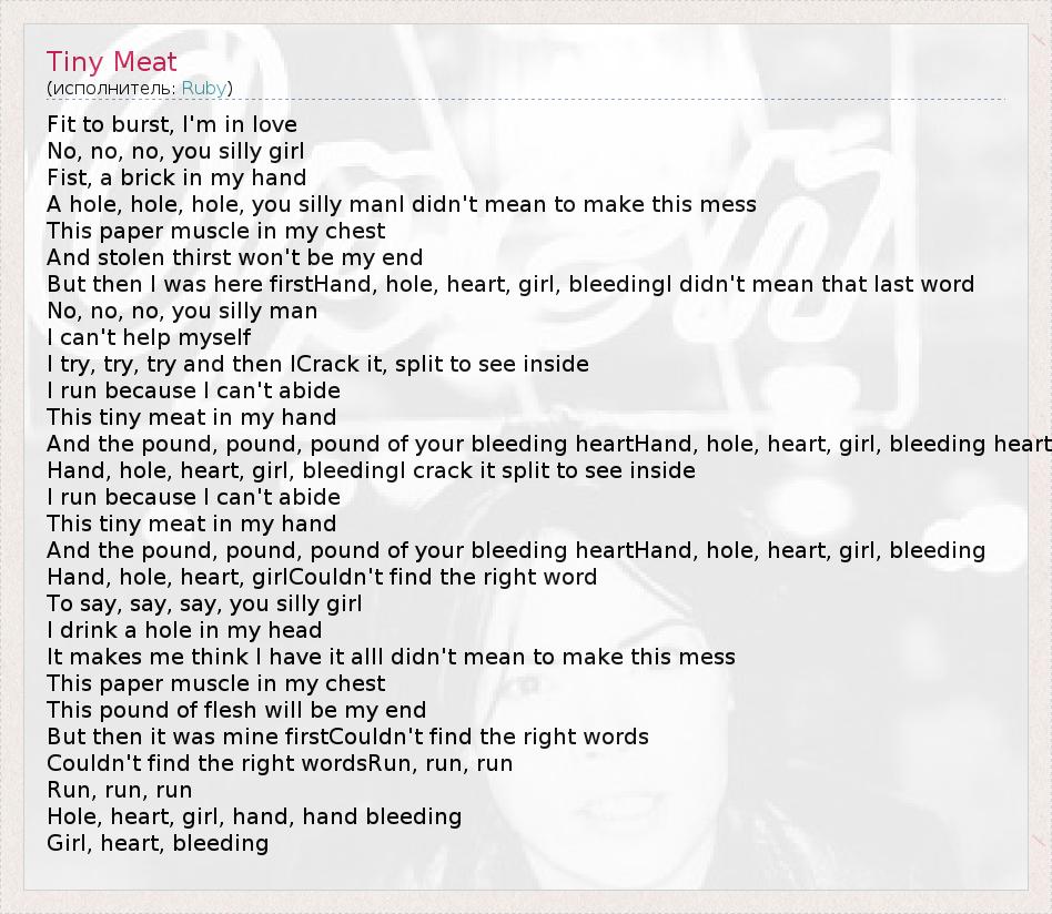 Fit to burst, I'm in love No, no, no, you silly girl Fist, a brick in my hand A hole, hole, hole, you silly manI didn't mean to make this mess This paper muscle in my chest And stolen thirst won't be my end But then I was here firstHand, hole, heart, girl, bleedingI didn't mean that last word No, no, no, you silly man I can't help myself I try, try, try and then ICrack it, split to see inside I run because I can't abide This tiny meat in my hand And the pound, pound, pound of your bleeding heartHand, hole, heart, girl, bleeding heart Hand, hole, heart, girl, bleedingI crack it split to see inside I run because I can't abide This tiny meat in my hand And the pound, pound, pound of your bleeding heartHand, hole, heart, girl, bleeding Hand, hole, heart, girlCouldn't find the right word To say, say, say, you silly girl I drink a hole in my head It makes me think I have it allI didn't mean to make this mess This paper muscle in my chest This pound of flesh will be my end But then it was mine firstCouldn't find the right words Couldn't find the right wordsRun, run, run Run, run, run Hole, heart, girl, hand, hand bleeding Girl, heart, bleeding