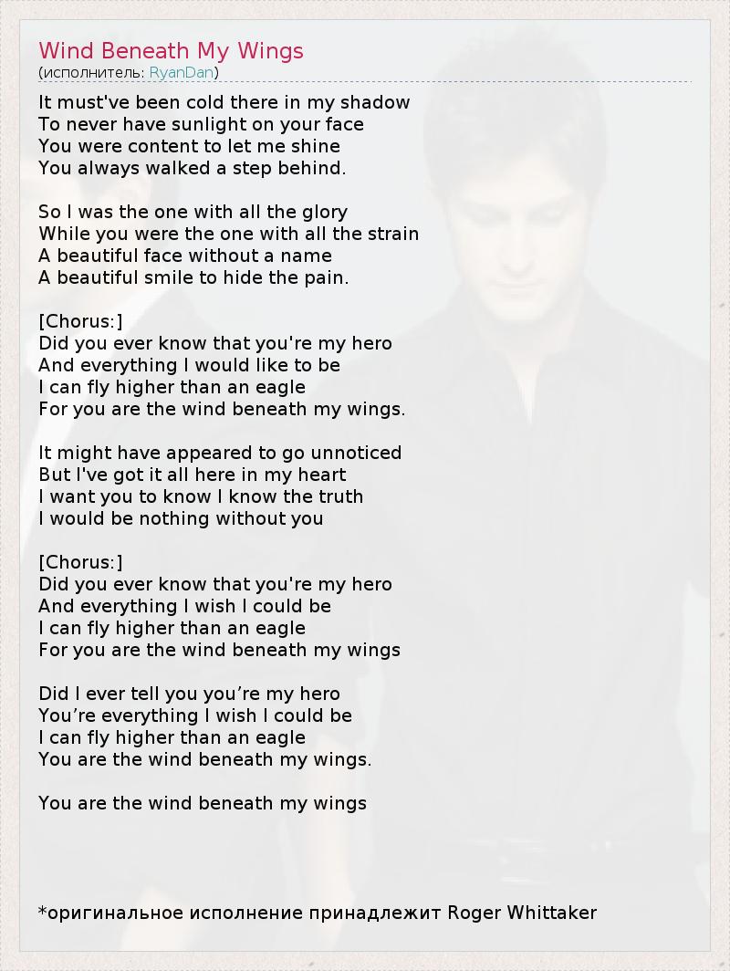 It must've been cold there in my shadow To never have sunlight on your face You were content to let me shine You always walked a step behind. So I was the one with all the glory While you were the one with all the strain A beautiful face without a name A beautiful smile to hide the pain. [Chorus:] Did you ever know that you're my hero And everything I would like to be I can fly higher than an eagle For you are the wind beneath my wings. It might have appeared to go unnoticed But I've got it all here in my heart I want you to know I know the truth I would be nothing without you [Chorus:] Did you ever know that you're my hero And everything I wish I could be I can fly higher than an eagle For you are the wind beneath my wings Did I ever tell you you’re my hero You’re everything I wish I could be I can fly higher than an eagle You are the wind beneath my wings. You are the wind beneath my wings *оригинальное исполнение принадлежит Roger Whittaker