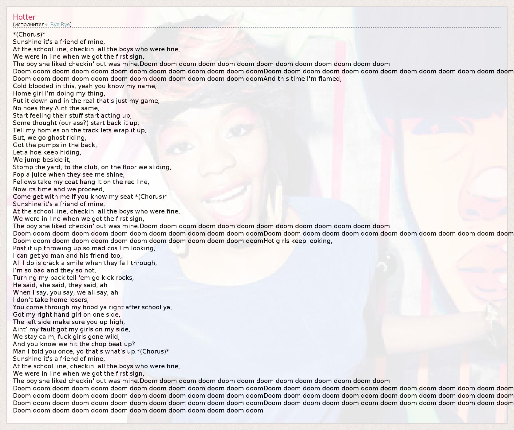 Это интересно:Rye Rye is the stage name of Ryeisha Berrain, an American rapper and dancer from Baltimore, Maryland, United States signed to N.E.E.T. Recordings. She is currently writing and recording her debut album, Go! Pop! Bang!, scheduled for release in January 2011.Born:November 1990 (age 20)Years active:2000sFollow Rye Rye on twitterRye Rye's Facebook Early careerRye Rye began performing at the age of 16. She wanted to join the music industry... продолжение