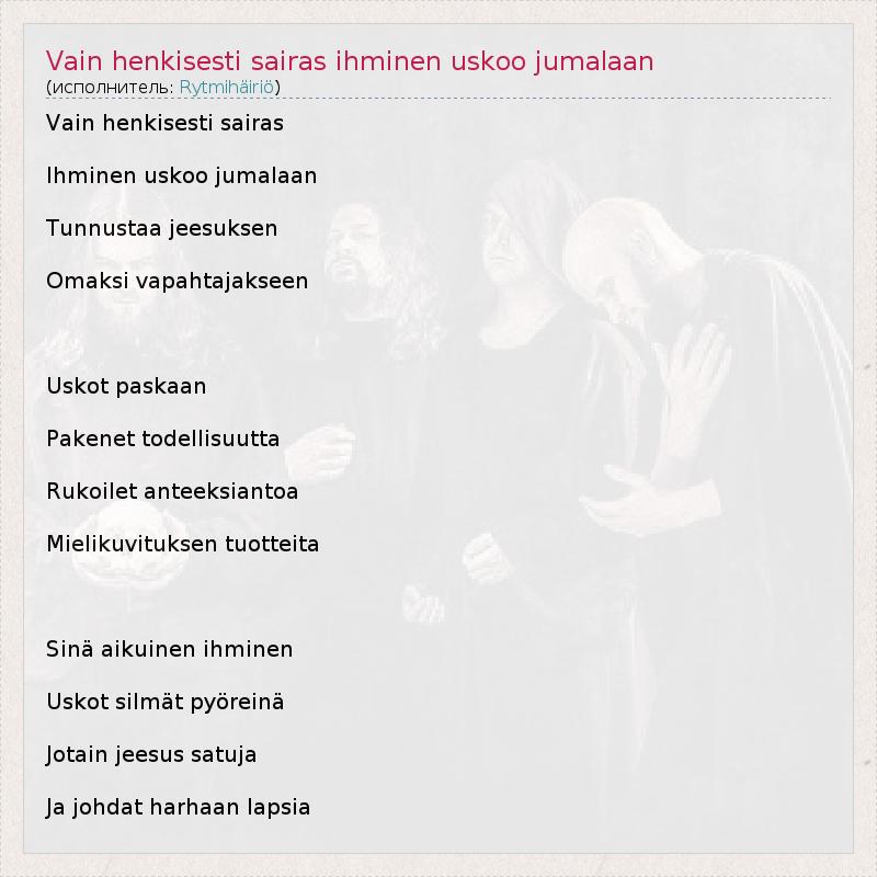 А как ты думаешь, о чем песня "Vain henkisesti sairas ihminen uskoo jumalaan" ?