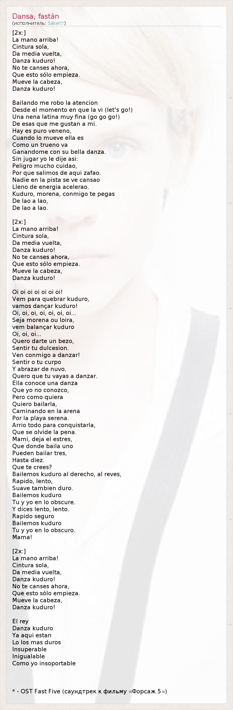 [2x:] La mano arriba! Cintura sola, Da media vuelta, Danza kuduro! No te canses ahora, Que esto sólo empieza. Mueve la cabeza, Danza kuduro! Bailando me robo la atencion Desde el momento en que la vi (let's go!) Una nena latina muy fina (go go go!) De esas que me gustan a mi. Hay es puro veneno, Cuando lo mueve ella es Como un trueno va Ganandome con su bella danza. Sin jugar yo le dije asi: Peligro mucho cuidao, Por que salimos de aqui zafao. Nadie en la pista se ve cansao Lleno de energia acelerao. Kuduro, morena, conmigo te pegas De lao a lao, De lao a lao. [2x:] La mano arriba! Cintura sola, Da media vuelta, Danza kuduro! No te canses ahora, Que esto sólo empieza. Mueve la cabeza, Danza kuduro! Oi oi oi oi oi oi oi! Vem para quebrar kuduro, vamos dançar kuduro! Oi, oi, oi, oi, oi, oi, oi... Seja morena ou loira, vem balançar kuduro Oi, oi, oi... Quero darte un bezo, Sentir tu dulcesion. Ven conmigo a danzar! Sentir o tu curpo Y abrazar de nuvo. Quero que tu vayas a danzar. Ella conoce una danza Que yo no conozco, Pero como quiera Quiero bailarla, Caminando en la arena Por la playa serena. Arrio todo para conquistarla, Que se olvide la pena. Mami, deja el estres, Que donde baila uno Pueden bailar tres, Hasta diez. Que te crees? Bailemos kuduro al derecho, al reves, Rapido, lento, Suave tambien duro. Bailemos kuduro Tu y yo en lo obscure. Y dices lento, lento. Rapido seguro Bailemos kuduro Tu y yo en lo obscuro. Mama! [2x:] La mano arriba! Cintura sola, Da media vuelta, Danza kuduro! No te canses ahora, Que esto sólo empieza. Mueve la cabeza, Danza kuduro! El rey Danza kuduro Ya aqui estan Lo los mas duros Insuperable Inigualable Como yo insoportable * - OST Fast Five (саундтрек к фильму «Форсаж 5»)
