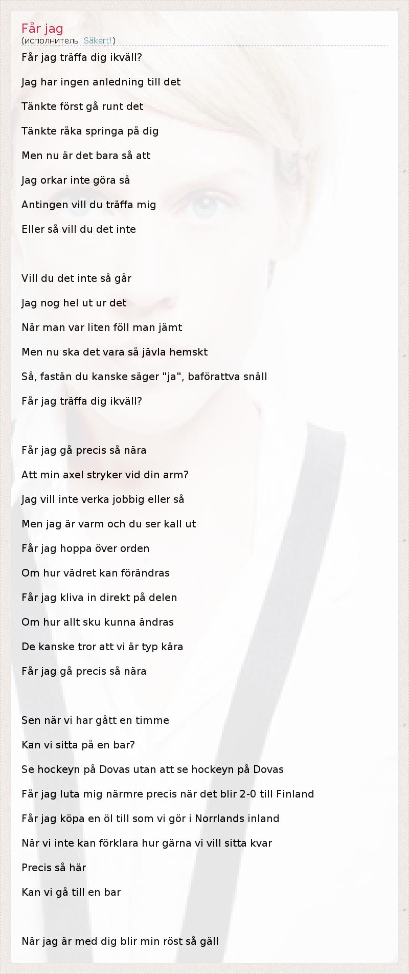 Får jag träffa dig ikväll? Jag har ingen anledning till det Tänkte först gå runt det Tänkte råka springa på dig Men nu är det bara så att Jag orkar inte göra så Antingen vill du träffa mig Eller så vill du det inte Vill du det inte så går Jag nog hel ut ur det När man var liten föll man jämt Men nu ska det vara så jävla hemskt Så, fastän du kanske säger "ja", baförattva snäll Får jag träffa dig ikväll? Får jag gå precis så nära Att min axel stryker vid din arm? Jag vill inte verka jobbig eller så Men jag är varm och du ser kall ut Får jag hoppa över orden Om hur vädret kan förändras Får jag kliva in direkt på delen Om hur allt sku kunna ändras De kanske tror att vi är typ kära Får jag gå precis så nära Sen när vi har gått en timme Kan vi sitta på en bar? Se hockeyn på Dovas utan att se hockeyn på Dovas Får jag luta mig närmre precis när det blir 2-0 till Finland Får jag köpa en öl till som vi gör i Norrlands inland När vi inte kan förklara hur gärna vi vill sitta kvar Precis så här Kan vi gå till en bar När jag är med dig blir min röst så gäll