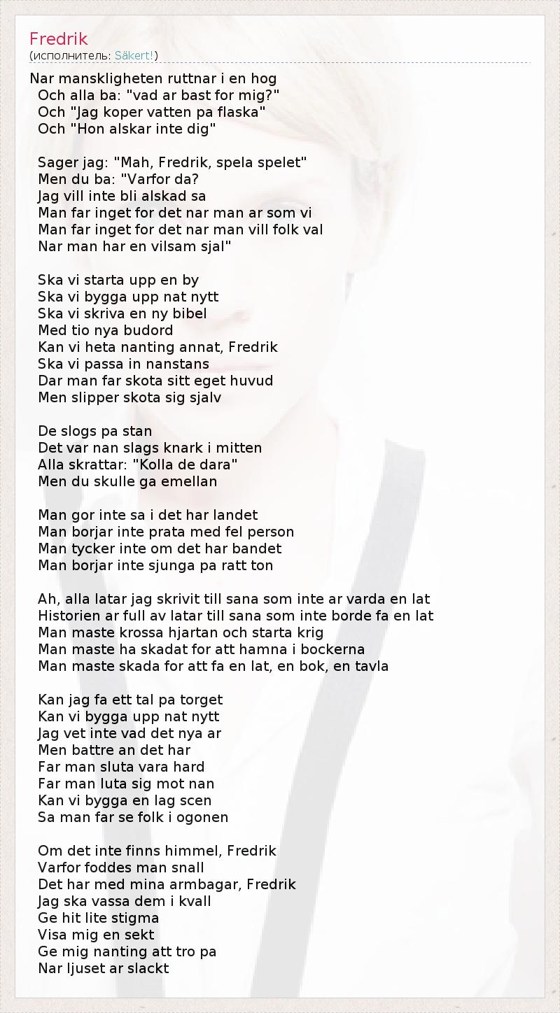 Nar manskligheten ruttnar i en hog Och alla ba: "vad ar bast for mig?" Och "Jag koper vatten pa flaska" Och "Hon alskar inte dig" Sager jag: "Mah, Fredrik, spela spelet" Men du ba: "Varfor da? Jag vill inte bli alskad sa Man far inget for det nar man ar som vi Man far inget for det nar man vill folk val Nar man har en vilsam sjal" Ska vi starta upp en by Ska vi bygga upp nat nytt Ska vi skriva en ny bibel Med tio nya budord Kan vi heta nanting annat, Fredrik Ska vi passa in nanstans Dar man far skota sitt eget huvud Men slipper skota sig sjalv De slogs pa stan Det var nan slags knark i mitten Alla skrattar: "Kolla de dara" Men du skulle ga emellan Man gor inte sa i det har landet Man borjar inte prata med fel person Man tycker inte om det har bandet Man borjar inte sjunga pa ratt ton Ah, alla latar jag skrivit till sana som inte ar varda en lat Historien ar full av latar till sana som inte borde fa en lat Man maste krossa hjartan och starta krig Man maste ha skadat for att hamna i bockerna Man maste skada for att fa en lat, en bok, en tavla Kan jag fa ett tal pa torget Kan vi bygga upp nat nytt Jag vet inte vad det nya ar Men battre an det har Far man sluta vara hard Far man luta sig mot nan Kan vi bygga en lag scen Sa man far se folk i ogonen Om det inte finns himmel, Fredrik Varfor foddes man snall Det har med mina armbagar, Fredrik Jag ska vassa dem i kvall Ge hit lite stigma Visa mig en sekt Ge mig nanting att tro pa Nar ljuset ar slackt