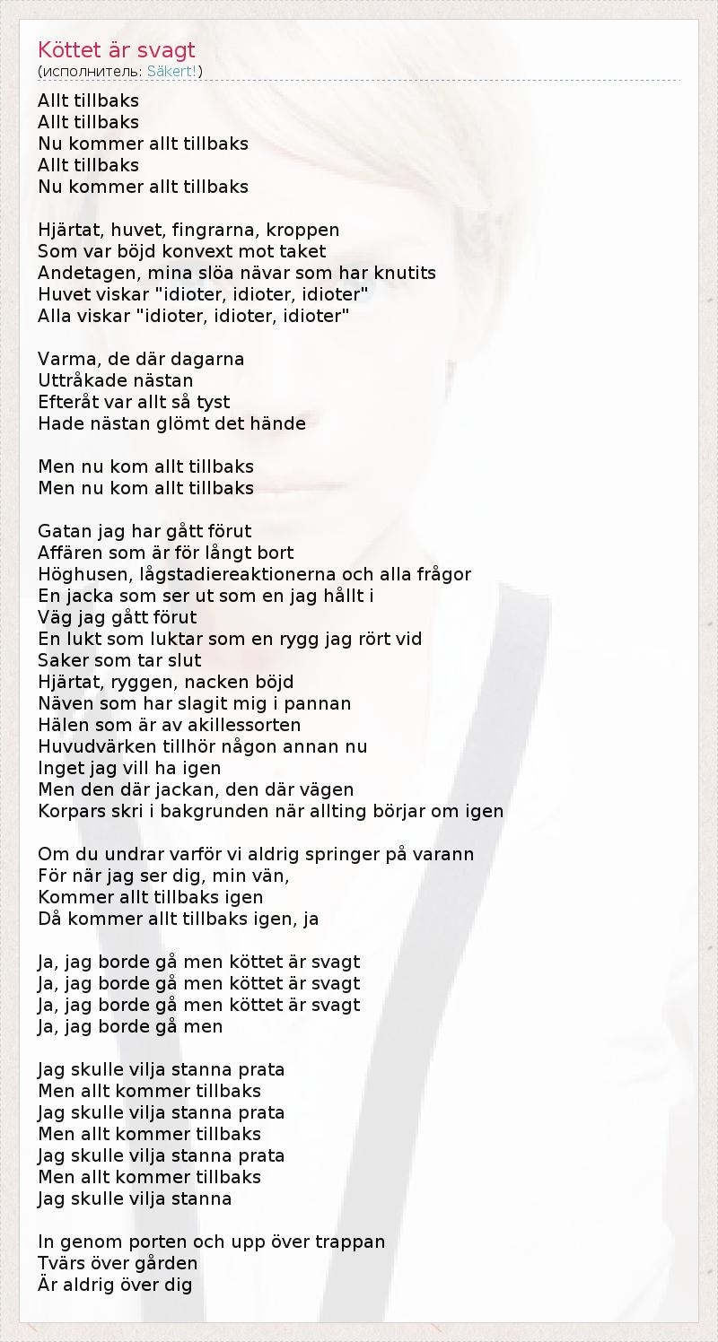 Allt tillbaks Allt tillbaks Nu kommer allt tillbaks Allt tillbaks Nu kommer allt tillbaks Hjärtat, huvet, fingrarna, kroppen Som var böjd konvext mot taket Andetagen, mina slöa nävar som har knutits Huvet viskar "idioter, idioter, idioter" Alla viskar "idioter, idioter, idioter" Varma, de där dagarna Uttråkade nästan Efteråt var allt så tyst Hade nästan glömt det hände Men nu kom allt tillbaks Men nu kom allt tillbaks Gatan jag har gått förut Affären som är för långt bort Höghusen, lågstadiereaktionerna och alla frågor En jacka som ser ut som en jag hållt i Väg jag gått förut En lukt som luktar som en rygg jag rört vid Saker som tar slut Hjärtat, ryggen, nacken böjd Näven som har slagit mig i pannan Hälen som är av akillessorten Huvudvärken tillhör någon annan nu Inget jag vill ha igen Men den där jackan, den där vägen Korpars skri i bakgrunden när allting börjar om igen Om du undrar varför vi aldrig springer på varann För när jag ser dig, min vän, Kommer allt tillbaks igen Då kommer allt tillbaks igen, ja Ja, jag borde gå men köttet är svagt Ja, jag borde gå men köttet är svagt Ja, jag borde gå men köttet är svagt Ja, jag borde gå men Jag skulle vilja stanna prata Men allt kommer tillbaks Jag skulle vilja stanna prata Men allt kommer tillbaks Jag skulle vilja stanna prata Men allt kommer tillbaks Jag skulle vilja stanna In genom porten och upp över trappan Tvärs över gården Är aldrig över dig