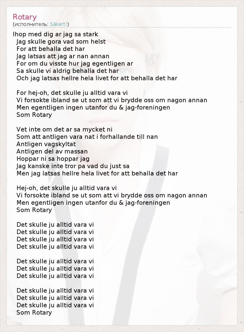 Ihop med dig ar jag sa stark Jag skulle gora vad som helst For att behalla det har Jag latsas att jag ar nan annan For om du visste hur jag egentligen ar Sa skulle vi aldrig behalla det har Och jag latsas hellre hela livet for att behalla det har For hej-oh, det skulle ju alltid vara vi Vi forsokte ibland se ut som att vi brydde oss om nagon annan Men egentligen ingen utanfor du & jag-foreningen Som Rotary Vet inte om det ar sa mycket ni Som att antligen vara nat i forhallande till nan Antligen vagskyltat Antligen del av massan Hoppar ni sa hoppar jag Jag kanske inte tror pa vad du just sa Men jag latsas hellre hela livet for att behalla det har Hej-oh, det skulle ju alltid vara vi Vi forsokte ibland se ut som att vi brydde oss om nagon annan Men egentligen ingen utanfor du & jag-foreningen Som Rotary Det skulle ju alltid vara vi Det skulle ju alltid vara vi Det skulle ju alltid vara vi Det skulle ju alltid vara vi Det skulle ju alltid vara vi Det skulle ju alltid vara vi Det skulle ju alltid vara vi Det skulle ju alltid vara vi Det skulle ju alltid vara vi Det skulle ju alltid vara vi Som Rotary