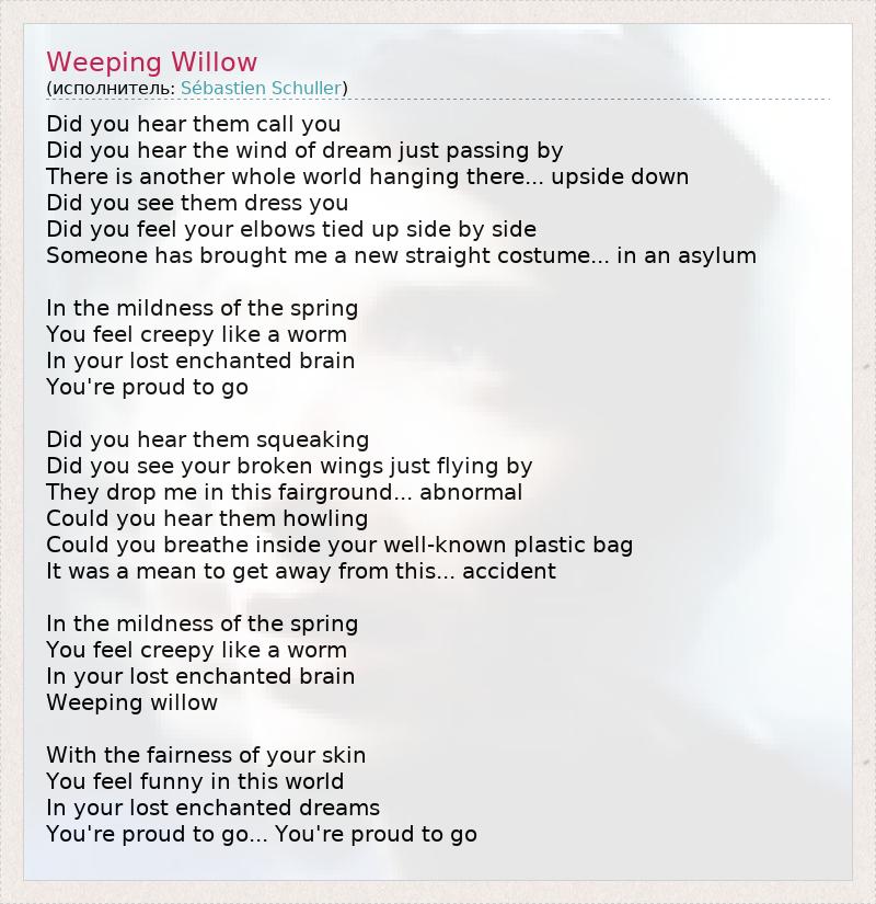 Did you hear them call you Did you hear the wind of dream just passing by There is another whole world hanging there... upside down Did you see them dress you Did you feel your elbows tied up side by side Someone has brought me a new straight costume... in an asylum In the mildness of the spring You feel creepy like a worm In your lost enchanted brain You're proud to go Did you hear them squeaking Did you see your broken wings just flying by They drop me in this fairground... abnormal Could you hear them howling Could you breathe inside your well-known plastic bag It was a mean to get away from this... accident In the mildness of the spring You feel creepy like a worm In your lost enchanted brain Weeping willow With the fairness of your skin You feel funny in this world In your lost enchanted dreams You're proud to go... You're proud to go