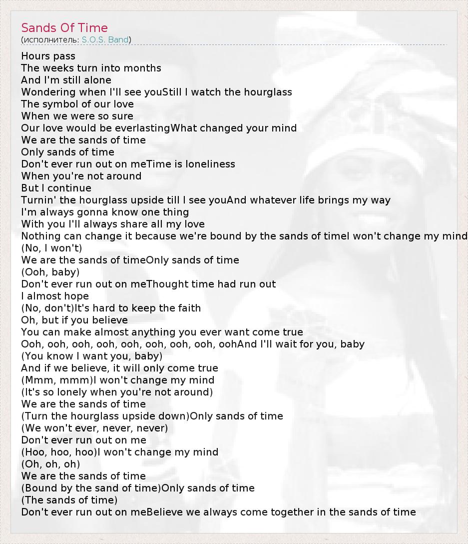 Hours pass The weeks turn into months And I'm still alone Wondering when I'll see youStill I watch the hourglass The symbol of our love When we were so sure Our love would be everlastingWhat changed your mind We are the sands of time Only sands of time Don't ever run out on meTime is loneliness When you're not around But I continue Turnin' the hourglass upside till I see youAnd whatever life brings my way I'm always gonna know one thing With you I'll always share all my love Nothing can change it because we're bound by the sands of timeI won't change my mind (No, I won't) We are the sands of timeOnly sands of time (Ooh, baby) Don't ever run out on meThought time had run out I almost hope (No, don't)It's hard to keep the faith Oh, but if you believe You can make almost anything you ever want come true Ooh, ooh, ooh, ooh, ooh, ooh, ooh, ooh, oohAnd I'll wait for you, baby (You know I want you, baby) And if we believe, it will only come true (Mmm, mmm)I won't change my mind (It's so lonely when you're not around) We are the sands of time (Turn the hourglass upside down)Only sands of time (We won't ever, never, never) Don't ever run out on me (Hoo, hoo, hoo)I won't change my mind (Oh, oh, oh) We are the sands of time (Bound by the sand of time)Only sands of time (The sands of time) Don't ever run out on meBelieve we always come together in the sands of time