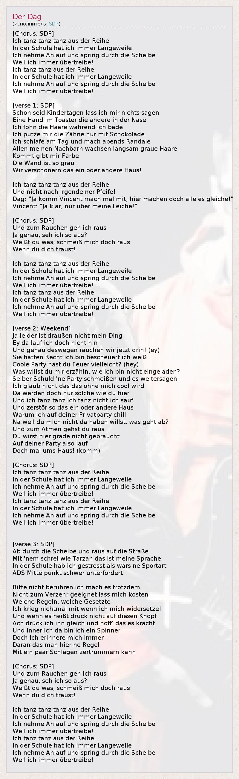[Chorus: SDP] Ich tanz tanz tanz aus der Reihe In der Schule hat ich immer Langeweile Ich nehme Anlauf und spring durch die Scheibe Weil ich immer übertreibe! Ich tanz tanz aus der Reihe In der Schule hat ich immer Langeweile Ich nehme Anlauf und spring durch die Scheibe Weil ich immer übertreibe! [verse 1: SDP] Schon seid Kindertagen lass ich mir nichts sagen Eine Hand im Toaster die andere in der Nase Ich föhn die Haare während ich bade Ich putze mir die Zähne nur mit Schokolade Ich schlafe am Tag und mach abends Randale Allen meinen Nachbarn wachsen langsam graue Haare Kommt gibt mir Farbe Die Wand ist so grau Wir verschönern das ein oder andere Haus! Ich tanz tanz tanz aus der Reihe Und nicht nach irgendeiner Pfeife! Dag: "Ja komm Vincent mach mal mit, hier machen doch alle es gleiche!" Vincent: "Ja klar, nur über meine Leiche!" [Chorus: SDP] Und zum Rauchen geh ich raus Ja genau, seh ich so aus? Weißt du was, schmeiß mich doch raus Wenn du dich traust! Ich tanz tanz tanz aus der Reihe In der Schule hat ich immer Langeweile Ich nehme Anlauf und spring durch die Scheibe Weil ich immer übertreibe! Ich tanz tanz aus der Reihe In der Schule hat ich immer Langeweile Ich nehme Anlauf und spring durch die Scheibe Weil ich immer übertreibe! [verse 2: Weekend] Ja leider ist draußen nicht mein Ding Ey da lauf ich doch nicht hin Und genau deswegen rauchen wir jetzt drin! (ey) Sie hatten Recht ich bin bescheuert ich weiß Coole Party hast du Feuer vielleicht? (hey) Was willst du mir erzähln, wie ich bin nicht eingeladen? Selber Schuld 'ne Party schmeißen und es weitersagen Ich glaub nicht das das ohne mich cool wird Da werden doch nur solche wie du hier Und ich tanz tanz ich tanz nicht ich sauf Und zerstör so das ein oder andere Haus Warum ich auf deiner Privatparty chill Na weil du mich nicht da haben willst, was geht ab? Und zum Atmen gehst du raus Du wirst hier grade nicht gebraucht Auf deiner Party also lauf Doch mal ums Haus! (komm) [Chorus: SDP] Ich tanz tanz tanz aus der Reihe In der Schule hat ich immer Langeweile Ich nehme Anlauf und spring durch die Scheibe Weil ich immer übertreibe! Ich tanz tanz tanz aus der Reihe In der Schule hat ich immer Langeweile Ich nehme Anlauf und spring durch die Scheibe Weil ich immer übertreibe! [verse 3: SDP] Ab durch die Scheibe und raus auf die Straße Mit 'nem schrei wie Tarzan das ist meine Sprache In der Schule hab ich gestresst als wärs ne Sportart ADS Mittelpunkt schwer unterfordert Bitte nicht berühren ich mach es trotzdem Nicht zum Verzehr geeignet lass mich kosten Welche Regeln, welche Gesetzte Ich krieg nichtmal mit wenn ich mich widersetze! Und wenn es heißt drück nicht auf diesen Knopf Ach drück ich ihn gleich und hoff' das es kracht Und innerlich da bin ich ein Spinner Doch ich erinnere mich immer Daran das man hier ne Regel Mit ein paar Schlägen zertrümmern kann [Chorus: SDP] Und zum Rauchen geh ich raus Ja genau, seh ich so aus? Weißt du was, schmeiß mich doch raus Wenn du dich traust! Ich tanz tanz tanz aus der Reihe In der Schule hat ich immer Langeweile Ich nehme Anlauf und spring durch die Scheibe Weil ich immer übertreibe! Ich tanz tanz aus der Reihe In der Schule hat ich immer Langeweile Ich nehme Anlauf und spring durch die Scheibe Weil ich immer übertreibe!