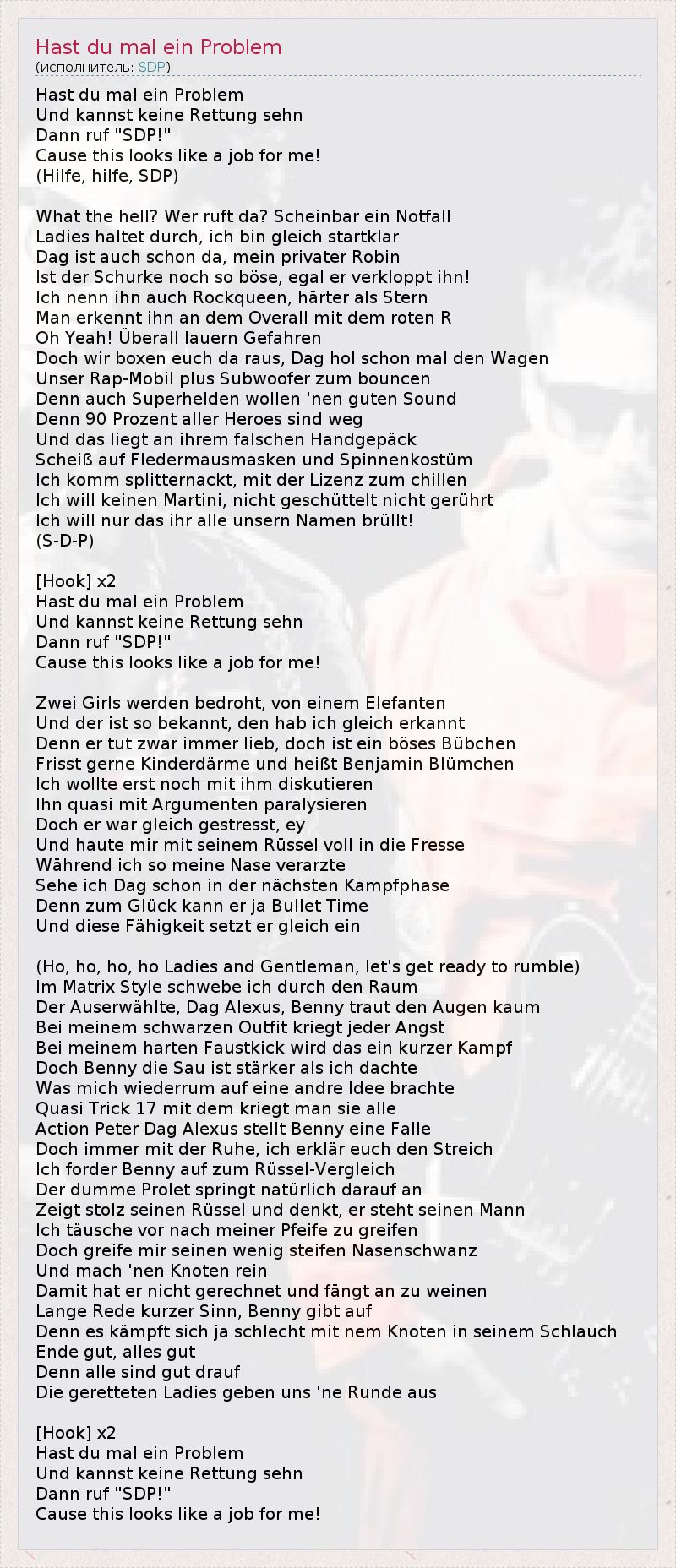 Hast du mal ein Problem Und kannst keine Rettung sehn Dann ruf "SDP!" Cause this looks like a job for me! (Hilfe, hilfe, SDP) What the hell? Wer ruft da? Scheinbar ein Notfall Ladies haltet durch, ich bin gleich startklar Dag ist auch schon da, mein privater Robin Ist der Schurke noch so böse, egal er verkloppt ihn! Ich nenn ihn auch Rockqueen, härter als Stern Man erkennt ihn an dem Overall mit dem roten R Oh Yeah! Überall lauern Gefahren Doch wir boxen euch da raus, Dag hol schon mal den Wagen Unser Rap-Mobil plus Subwoofer zum bouncen Denn auch Superhelden wollen 'nen guten Sound Denn 90 Prozent aller Heroes sind weg Und das liegt an ihrem falschen Handgepäck Scheiß auf Fledermausmasken und Spinnenkostüm Ich komm splitternackt, mit der Lizenz zum chillen Ich will keinen Martini, nicht geschüttelt nicht gerührt Ich will nur das ihr alle unsern Namen brüllt! (S-D-P) [Hook] x2 Hast du mal ein Problem Und kannst keine Rettung sehn Dann ruf "SDP!" Cause this looks like a job for me! Zwei Girls werden bedroht, von einem Elefanten Und der ist so bekannt, den hab ich gleich erkannt Denn er tut zwar immer lieb, doch ist ein böses Bübchen Frisst gerne Kinderdärme und heißt Benjamin Blümchen Ich wollte erst noch mit ihm diskutieren Ihn quasi mit Argumenten paralysieren Doch er war gleich gestresst, ey Und haute mir mit seinem Rüssel voll in die Fresse Während ich so meine Nase verarzte Sehe ich Dag schon in der nächsten Kampfphase Denn zum Glück kann er ja Bullet Time Und diese Fähigkeit setzt er gleich ein (Ho, ho, ho, ho Ladies and Gentleman, let's get ready to rumble) Im Matrix Style schwebe ich durch den Raum Der Auserwählte, Dag Alexus, Benny traut den Augen kaum Bei meinem schwarzen Outfit kriegt jeder Angst Bei meinem harten Faustkick wird das ein kurzer Kampf Doch Benny die Sau ist stärker als ich dachte Was mich wiederrum auf eine andre Idee brachte Quasi Trick 17 mit dem kriegt man sie alle Action Peter Dag Alexus stellt Benny eine Falle Doch immer mit der Ruhe, ich erklär euch den Streich Ich forder Benny auf zum Rüssel-Vergleich Der dumme Prolet springt natürlich darauf an Zeigt stolz seinen Rüssel und denkt, er steht seinen Mann Ich täusche vor nach meiner Pfeife zu greifen Doch greife mir seinen wenig steifen Nasenschwanz Und mach 'nen Knoten rein Damit hat er nicht gerechnet und fängt an zu weinen Lange Rede kurzer Sinn, Benny gibt auf Denn es kämpft sich ja schlecht mit nem Knoten in seinem Schlauch Ende gut, alles gut Denn alle sind gut drauf Die geretteten Ladies geben uns 'ne Runde aus [Hook] x2 Hast du mal ein Problem Und kannst keine Rettung sehn Dann ruf "SDP!" Cause this looks like a job for me!