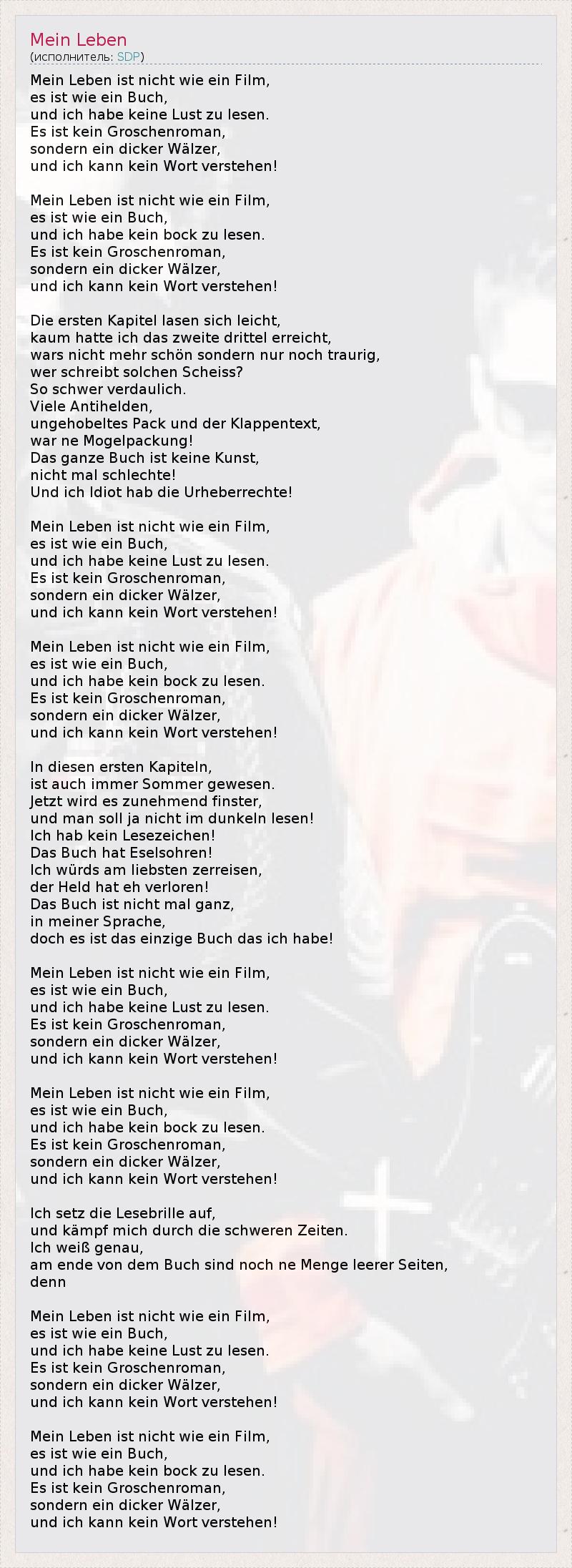 Mein Leben ист Nicht Wie Эйн Кино, эс ист Wie Эйн Бух , унд ич хабе Keine Lust цу Lesen . Es ист Kein Groschenroman , SONDERN Эйн торговаться Уолцер , унд ич канн Kein сусла Verstehen ! Mein Leben ист Nicht Wie Эйн Кино, эс ист Wie Эйн Бух , унд ич хабе Kein Bock цу Lesen . Es ист Kein Groschenroman , SONDERN Эйн торговаться Уолцер , унд ич канн Kein сусла Verstehen ! Die Ersten Капитель Ласен Сич Leicht , Kaum Hatte ич дас Zweite drittel erreicht , войны Nicht Mehr schön SONDERN нур Ночь Traurig , WER schreibt solchen SCHEISS ? Так Schwer verdaulich . Viele Antihelden , ungehobeltes обновления унд дер Klappentext , War пе Mogelpackung ! Das Ganze Бух ист Keine Kunst, Nicht мал Schlechte ! Und ич Идиот хаб умереть Urheberrechte ! Mein Leben ист Nicht Wie Эйн Кино, эс ист Wie Эйн Бух , унд ич хабе Keine Lust цу Lesen . Es ист Kein Groschenroman , SONDERN Эйн торговаться Уолцер , унд ич канн Kein сусла Verstehen ! Mein Leben ист Nicht Wie Эйн Кино, эс ист Wie Эйн Бух , унд ич хабе Kein Bock цу Lesen . Es ист Kein Groschenroman , SONDERN Эйн торговаться Уолцер , унд ич канн Kein сусла Verstehen ! В Diesen Ersten Kapiteln , ист Ош Immer Соммер gewesen . Jetzt вирда эс zunehmend Finster , унд человек Soll JA Nicht им Dunkeln Lesen ! Ich хаб Kein Lesezeichen ! Das Buch шляпа Eselsohren ! Ich würds утра liebsten zerreisen , дер , удерживаемые шляпа а Верлорен ! Das Buch ист Nicht мал Ганц , в Meiner Sprache , Дочь -эс- ист дас einzige Бух Das Ich хабе ! Mein Leben ист Nicht Wie Эйн Кино, эс ист Wie Эйн Бух , унд ич хабе Keine Lust цу Lesen . Es ист Kein Groschenroman , SONDERN Эйн торговаться Уолцер , унд ич канн Kein сусла Verstehen ! Mein Leben ист Nicht Wie Эйн Кино, эс ист Wie Эйн Бух , унд ич хабе Kein Bock цу Lesen . Es ист Kein Groschenroman , SONDERN Эйн торговаться Уолцер , унд ич канн Kein сусла Verstehen ! Ich Setz умереть Lesebrille Auf , унд Kämpf Mich Durch умирают schweren Zeiten . Ich Weiss Genau , утра Ende фон дем Бух Синд Ночь пе Menge Leerer Шаблоны , Denn Mein Leben ист Nicht Wie Эйн Кино, эс ист Wie Эйн Бух , унд ич хабе Keine Lust цу Lesen . Es ист Kein Groschenroman , SONDERN Эйн торговаться Уолцер , унд ич канн Kein сусла Verstehen ! Mein Leben ист Nicht Wie Эйн Кино, эс ист Wie Эйн Бух , унд ич хабе Kein Bock цу Lesen . Es ист Kein Groschenroman , SONDERN Эйн торговаться Уолцер , унд ич канн Kein сусла Verstehen !