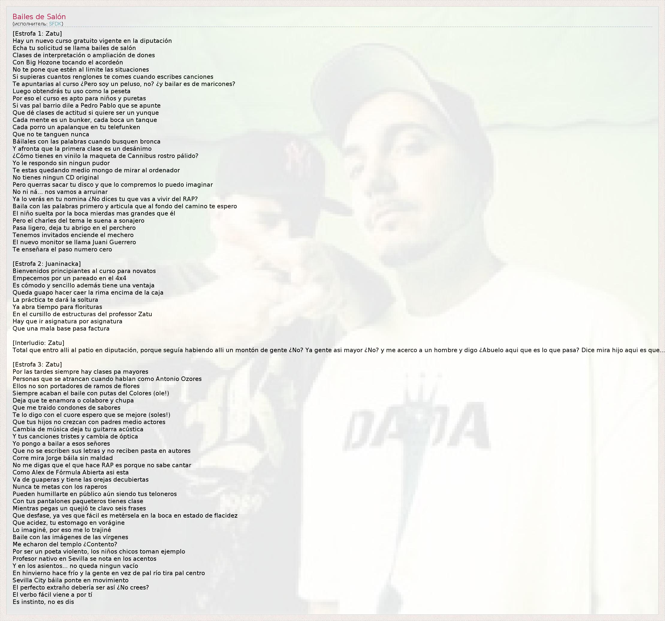 [Estrofa 1: Zatu] Hay un nuevo curso gratuito vigente en la diputación Echa tu solicitud se llama bailes de salón Clases de interpretación o ampliación de dones Con Big Hozone tocando el acordeón No te pone que estén al limite las situaciones Si supieras cuantos renglones te comes cuando escribes canciones Te apuntarias al curso ¿Pero soy un peluso, no? ¿y bailar es de maricones? Luego obtendrás tu uso como la peseta Por eso el curso es apto para niños y puretas Si vas pal barrio dile a Pedro Pablo que se apunte Que dé clases de actitud si quiere ser un yunque Cada mente es un bunker, cada boca un tanque Cada porro un apalanque en tu telefunken Que no te tanguen nunca Báilales con las palabras cuando busquen bronca Y afronta que la primera clase es un desánimo ¿Cómo tienes en vinilo la maqueta de Cannibus rostro pálido? Yo le respondo sin ningun pudor Te estas quedando medio mongo de mirar al ordenador No tienes ningun CD original Pero querras sacar tu disco y que lo compremos lo puedo imaginar No ni ná... nos vamos a arruinar Ya lo verás en tu nomina ¿No dices tu que vas a vivir del RAP? Baila con las palabras primero y articula que al fondo del camino te espero El niño suelta por la boca mierdas mas grandes que él Pero el charles del tema le suena a sonajero Pasa ligero, deja tu abrigo en el perchero Tenemos invitados enciende el mechero El nuevo monitor se llama Juani Guerrero Te enseñara el paso numero cero [Estrofa 2: Juaninacka] Bienvenidos principiantes al curso para novatos Empecemos por un pareado en el 4x4 Es cómodo y sencillo además tiene una ventaja Queda guapo hacer caer la rima encima de la caja La práctica te dará la soltura Ya abra tiempo para florituras En el cursillo de estructuras del professor Zatu Hay que ir asignatura por asignatura Que una mala base pasa factura [Interludio: Zatu] Total que entro alli al patio en diputación, porque seguía habiendo alli un montón de gente ¿No? Ya gente asi mayor ¿No? y me acerco a un hombre y digo ¿Abuelo aqui que es lo que pasa? Dice mira hijo aqui es que... [Estrofa 3: Zatu] Por las tardes siempre hay clases pa mayores Personas que se atrancan cuando hablan como Antonio Ozores Ellos no son portadores de ramos de flores Siempre acaban el baile con putas del Colores (ole!) Deja que te enamora o colabore y chupa Que me traido condones de sabores Te lo digo con el cuore espero que se mejore (soles!) Que tus hijos no crezcan con padres medio actores Cambia de música deja tu guitarra acústica Y tus canciones tristes y cambia de óptica Yo pongo a bailar a esos señores Que no se escriben sus letras y no reciben pasta en autores Corre mira Jorge báila sin maldad No me digas que el que hace RAP es porque no sabe cantar Como Alex de Fórmula Abierta asi esta Va de guaperas y tiene las orejas decubiertas Nunca te metas con los raperos Pueden humillarte en público aún siendo tus teloneros Con tus pantalones paqueteros tienes clase Mientras pegas un quejió te clavo seis frases Que desfase, ya ves que fácil es metérsela en la boca en estado de flacidez Que acidez, tu estomago en vorágine Lo imaginé, por eso me lo trajiné Baile con las imágenes de las vírgenes Me echaron del templo ¿Contento? Por ser un poeta violento, los niños chicos toman ejemplo Profesor nativo en Sevilla se nota en los acentos Y en los asientos... no queda ningun vacío En hinvierno hace frío y la gente en vez de pal río tira pal centro Sevilla City báila ponte en movimiento El perfecto extraño debería ser así ¿No crees? El verbo fácil viene a por tí Es instinto, no es dis