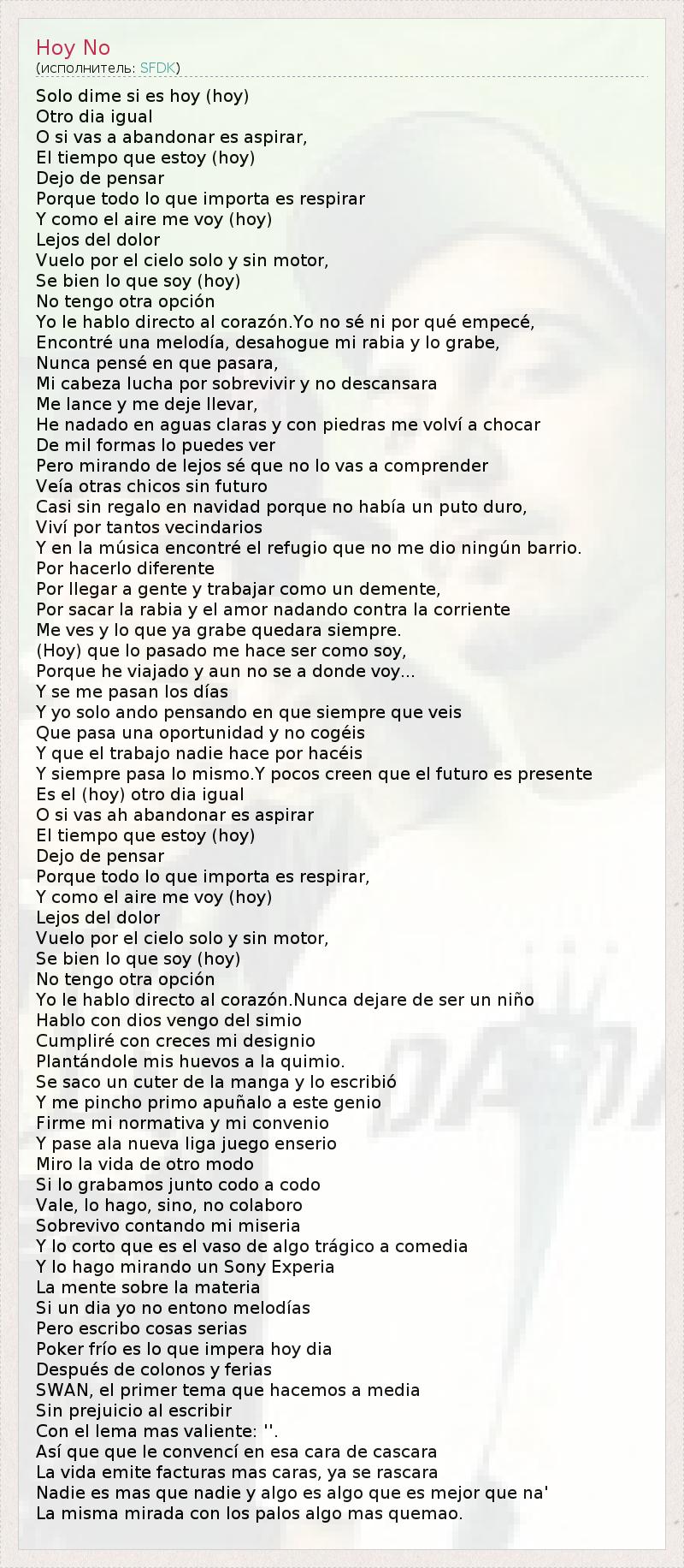 Solo dime si es hoy (hoy) Otro dia igual O si vas a abandonar es aspirar, El tiempo que estoy (hoy) Dejo de pensar Porque todo lo que importa es respirar Y como el aire me voy (hoy) Lejos del dolor Vuelo por el cielo solo y sin motor, Se bien lo que soy (hoy) No tengo otra opción Yo le hablo directo al corazón.Yo no sé ni por qué empecé, Encontré una melodía, desahogue mi rabia y lo grabe, Nunca pensé en que pasara, Mi cabeza lucha por sobrevivir y no descansara Me lance y me deje llevar, He nadado en aguas claras y con piedras me volví a chocar De mil formas lo puedes ver Pero mirando de lejos sé que no lo vas a comprender Veía otras chicos sin futuro Casi sin regalo en navidad porque no había un puto duro, Viví por tantos vecindarios Y en la música encontré el refugio que no me dio ningún barrio. Por hacerlo diferente Por llegar a gente y trabajar como un demente, Por sacar la rabia y el amor nadando contra la corriente Me ves y lo que ya grabe quedara siempre. (Hoy) que lo pasado me hace ser como soy, Porque he viajado y aun no se a donde voy... Y se me pasan los días Y yo solo ando pensando en que siempre que veis Que pasa una oportunidad y no cogéis Y que el trabajo nadie hace por hacéis Y siempre pasa lo mismo.Y pocos creen que el futuro es presente Es el (hoy) otro dia igual O si vas ah abandonar es aspirar El tiempo que estoy (hoy) Dejo de pensar Porque todo lo que importa es respirar, Y como el aire me voy (hoy) Lejos del dolor Vuelo por el cielo solo y sin motor, Se bien lo que soy (hoy) No tengo otra opción Yo le hablo directo al corazón.Nunca dejare de ser un niño Hablo con dios vengo del simio Cumpliré con creces mi designio Plantándole mis huevos a la quimio. Se saco un cuter de la manga y lo escribió Y me pincho primo apuñalo a este genio Firme mi normativa y mi convenio Y pase ala nueva liga juego enserio Miro la vida de otro modo Si lo grabamos junto codo a codo Vale, lo hago, sino, no colaboro Sobrevivo contando mi miseria Y lo corto que es el vaso de algo trágico a comedia Y lo hago mirando un Sony Experia La mente sobre la materia Si un dia yo no entono melodías Pero escribo cosas serias Poker frío es lo que impera hoy dia Después de colonos y ferias SWAN, el primer tema que hacemos a media Sin prejuicio al escribir Con el lema mas valiente: ''. Así que que le convencí en esa cara de cascara La vida emite facturas mas caras, ya se rascara Nadie es mas que nadie y algo es algo que es mejor que na' La misma mirada con los palos algo mas quemao.