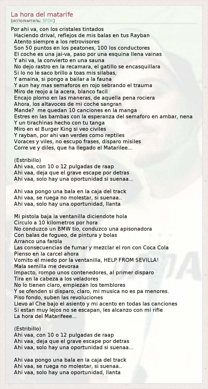 Por ahi va, con los cristales tintados Haciendo drival, reflejos de mis balas en tus Rayban Atento siempre a los retrovisores Son 50 puntos en los peatones, 100 los conductores El coche es una jai-va, paso por una esquina llena vainas Y ahi va, la convierto en una sauna No dejo rastro en la recamara, el gatillo se encasquillara Si lo no le saco brillo a toas mis silabas, Y amaina, si pongo a bailar a la fauna Y aun hay mas semaforos en rojo sebrando el trauma Miro de reojo a la acera, blanco facil Encajo plomo en las maneras, de aquella pena rociera Ahora, los altavoces de mi coche sangran Mande? me quedan 10 canciones en la manga Estres en las bambas con la esperanza del semaforo en ambar, nena Y un tirachinas hecho con tu tanga Miro en el Burger King si veo civiles Y rayban, por ahi van verdes como reptiles Voraces y viles, no escupo frases, disparo misiles Corre ve y diles, que ha llegado el Matarilee... (Estribillo) Ahi vaa, con 10 o 12 pulgadas de raap Ahi vaa, deja que el grave escape por detras Ahi vaa, solo hay una oportunidad si suenaa... Ahi vaa pongo una bala en la caja del track Ahi vaa, se ruega no molestar, si suenaa.. Ahi vaa, solo hay una oportunidad, llanta Mi pistola baja la ventanilla diciendote hola Circulo a 10 kilometros por hora No conduzco un BMW tio, conduzco una apisonadora Con balas de fogueo, de pintura y bolas Arranco una farola Las consecuencias de fumar y mezclar el ron con Coca Cola Pienso en la carcel ahora Vomito el miedo por la ventanilla, HELP FROM SEVILLA! Mala semilla me devoraa Impacto, rompo unos contenedores, al primer disparo Tira en la cabeza a los veladores No lo tienen claro, empiezan los temblores Y se ofenden si disparo, claro, mi musica no es pa menores. Piso fondo, suben las revoluciones Llevo al Che bajo el asiento y mi acento en todas las canciones Si estan muy lejos no se escapan, les alcanzo con mi rifle La hora del Matarifeee... (Estribillo) Ahi vaa, con 10 o 12 pulgadas de raap Ahi vaa, deja que el grave escape por detras Ahi vaa, solo hay una oportunidad si suenaa... Ahi vaa pongo una bala en la caja del track Ahi vaa, se ruega no molestar, si suenaa.. Ahi vaa, solo hay una oportunidad, llanta