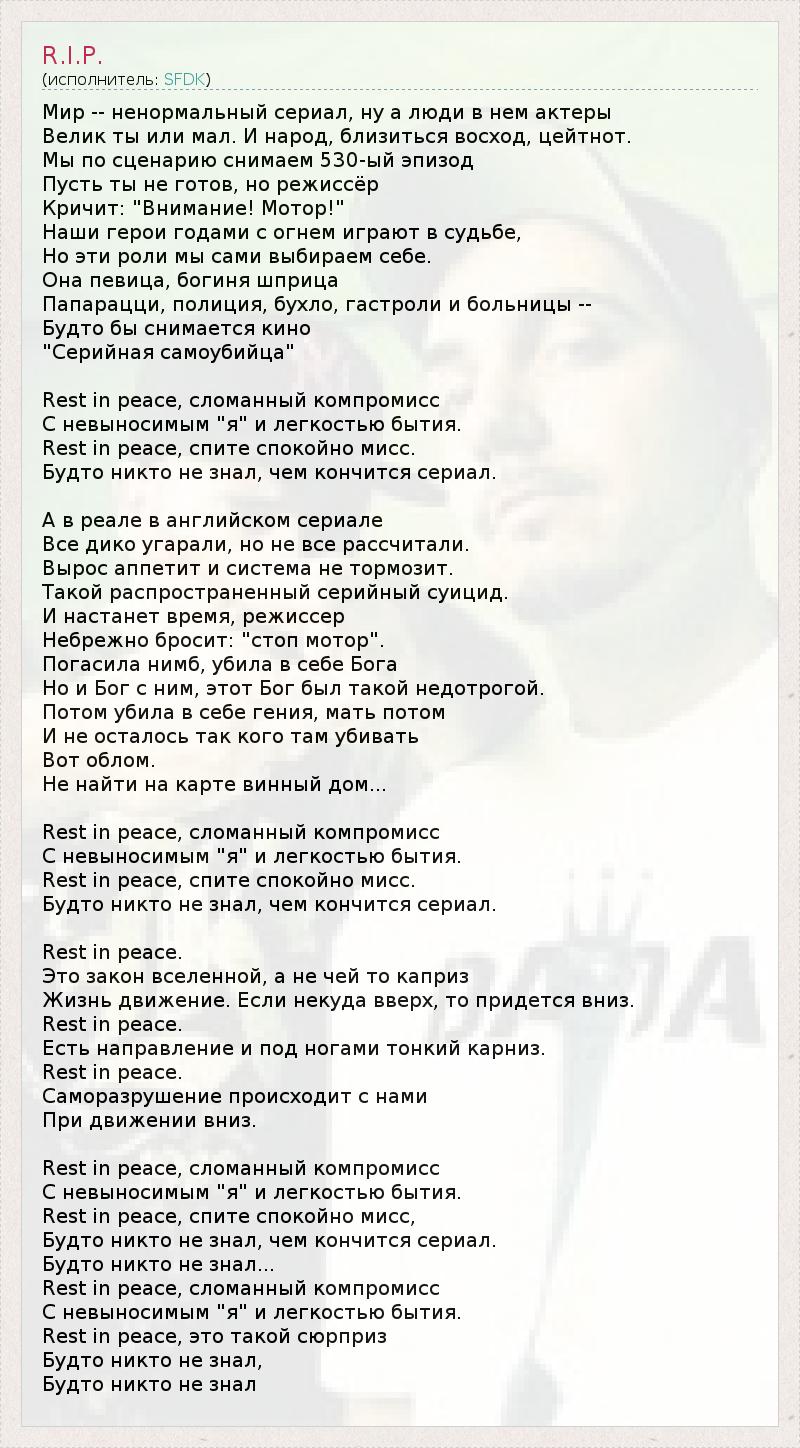 Мир -- ненормальный сериал, ну а люди в нем актеры Велик ты или мал. И народ, близиться восход, цейтнот. Мы по сценарию снимаем 530-ый эпизод Пусть ты не готов, но режиссёр Кричит: "Внимание! Мотор!" Наши герои годами с огнем играют в судьбе, Но эти роли мы сами выбираем себе. Она певица, богиня шприца Папарацци, полиция, бухло, гастроли и больницы -- Будто бы снимается кино "Серийная самоубийца" Rest in peace, сломанный компромисс С невыносимым "я" и легкостью бытия. Rest in peace, спите спокойно мисс. Будто никто не знал, чем кончится сериал. А в реале в английском сериале Все дико угарали, но не все рассчитали. Вырос аппетит и система не тормозит. Такой распространенный серийный суицид. И настанет время, режиссер Небрежно бросит: "стоп мотор". Погасила нимб, убила в себе Бога Но и Бог с ним, этот Бог был такой недотрогой. Потом убила в себе гения, мать потом И не осталось так кого там убивать Вот облом. Не найти на карте винный дом... Rest in peace, сломанный компромисс С невыносимым "я" и легкостью бытия. Rest in peace, спите спокойно мисс. Будто никто не знал, чем кончится сериал. Rest in peace. Это закон вселенной, а не чей то каприз Жизнь движение. Если некуда вверх, то придется вниз. Rest in peace. Есть направление и под ногами тонкий карниз. Rest in peace. Саморазрушение происходит с нами При движении вниз. Rest in peace, сломанный компромисс С невыносимым "я" и легкостью бытия. Rest in peace, спите спокойно мисс, Будто никто не знал, чем кончится сериал. Будто никто не знал... Rest in peace, сломанный компромисс С невыносимым "я" и легкостью бытия. Rest in peace, это такой сюрприз Будто никто не знал, Будто никто не знал