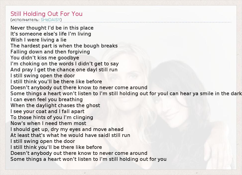 Never thought I'd be in this place It's someone else's life I'm living Wish I were living a lie The hardest part is when the bough breaks Falling down and then forgiving You didn't kiss me goodbye I'm choking on the words I didn't get to say And pray I get the chance one dayI still run I still swing open the door I still think you'll be there like before Doesn't anybody out there know to never come around Some things a heart won't listen to I'm still holding out for youI can hear ya smile in the dark I can even feel you breathing When the daylight chases the ghost I see your coat and I fall apart To those hints of you I'm clinging Now's when I need them most I should get up, dry my eyes and move ahead At least that's what he would have saidI still run I still swing open the door I still think you'll be there like before Doesn't anybody out there know to never come around Some things a heart won't listen to I'm still holding out for you