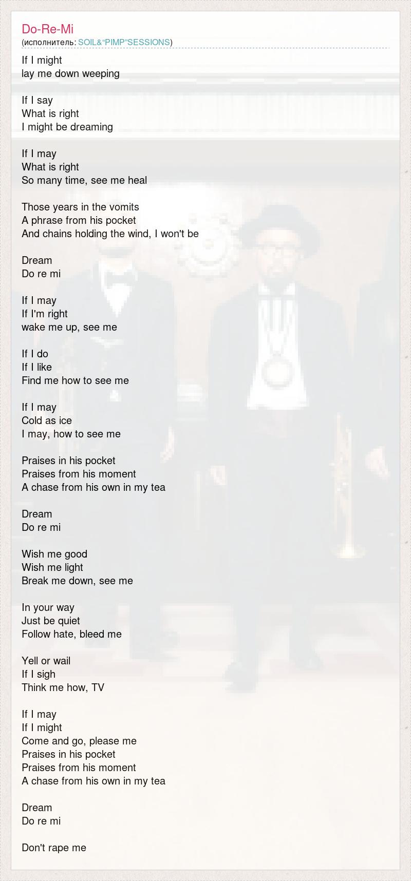 Если я попрошу - Оставь меня рыдать Если я спрошу, Что правильно? То я, должно быть, замечтался Если мне можно - Что правильно?! Узри меня, выздоравливающего Эти годы блевотины, Фразы из его кармана, И цепи, удерживающие ветер, я не буду... Мечтай, До Ре Ми Если мне можно, Если я буду прав, Разбуди меня, смотри на меня Если я сделаю, Если мне понравится, Найди меня, заметив меня Если мне можно - Холоден как лед, Я смогу, как ты заметишь меня Похвалы из его кармана, Похвалы от него Преследуют меня в чае Мечтай, До Ре Ми Пожелай мне добра, Пожелай мне света, Ударь меня оземь, увидь меня Просто будь молчалива, Как ты это умеешь, Следуй ненависти, пусти мне кровь Кричи или вопи, Если я вздохну, Думай обо мне, ТВ Если можно, Если попрошу, Приди и уйди, доставь мне удовольствие, Похвалы из его кармана, Похвалы от него Преследуют меня в чае Мечтай, До Ре Ми Не насилуй меня...