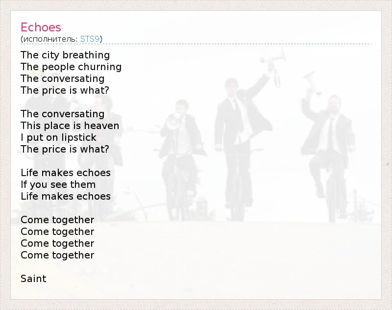 Дыхание города Вихрь людей Болтовня А какова цена? Болтовня Это место - рай Я накрвил губы помадой И какова цена? Жизнь отдается эхом Если ты их видишь Жизнь отдается эхом Объдиняйтесь Объединяйтесь
