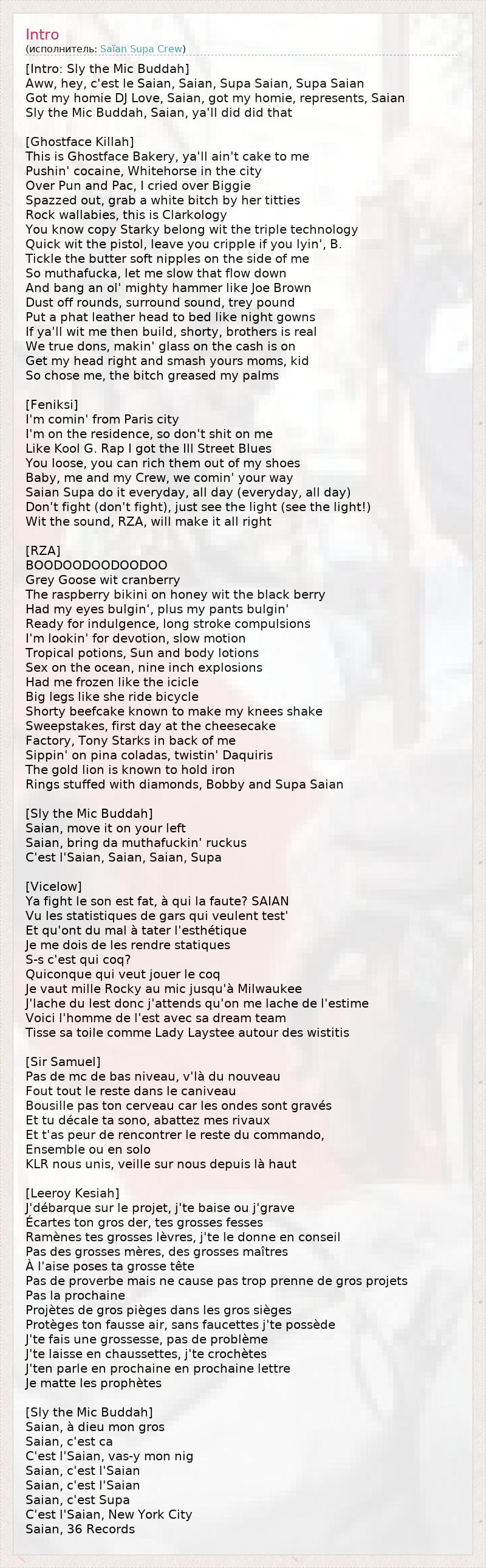 [Intro: Sly the Mic Buddah] Aww, hey, c'est le Saian, Saian, Supa Saian, Supa Saian Got my homie DJ Love, Saian, got my homie, represents, Saian Sly the Mic Buddah, Saian, ya'll did did that [Ghostface Killah] This is Ghostface Bakery, ya'll ain't cake to me Pushin' cocaine, Whitehorse in the city Over Pun and Pac, I cried over Biggie Spazzed out, grab a white bitch by her titties Rock wallabies, this is Clarkology You know copy Starky belong wit the triple technology Quick wit the pistol, leave you cripple if you lyin', B. Tickle the butter soft nipples on the side of me So muthafucka, let me slow that flow down And bang an ol' mighty hammer like Joe Brown Dust off rounds, surround sound, trey pound Put a phat leather head to bed like night gowns If ya'll wit me then build, shorty, brothers is real We true dons, makin' glass on the cash is on Get my head right and smash yours moms, kid So chose me, the bitch greased my palms [Feniksi] I'm comin' from Paris city I'm on the residence, so don't shit on me Like Kool G. Rap I got the Ill Street Blues You loose, you can rich them out of my shoes Baby, me and my Crew, we comin' your way Saian Supa do it everyday, all day (everyday, all day) Don't fight (don't fight), just see the light (see the light!) Wit the sound, RZA, will make it all right [RZA] BOODOODOODOODOO Grey Goose wit cranberry The raspberry bikini on honey wit the black berry Had my eyes bulgin', plus my pants bulgin' Ready for indulgence, long stroke compulsions I'm lookin' for devotion, slow motion Tropical potions, Sun and body lotions Sex on the ocean, nine inch explosions Had me frozen like the icicle Big legs like she ride bicycle Shorty beefcake known to make my knees shake Sweepstakes, first day at the cheesecake Factory, Tony Starks in back of me Sippin' on pina coladas, twistin' Daquiris The gold lion is known to hold iron Rings stuffed with diamonds, Bobby and Supa Saian [Sly the Mic Buddah] Saian, move it on your left Saian, bring da muthafuckin' ruckus C'est l'Saian, Saian, Saian, Supa [Vicelow] Ya fight le son est fat, à qui la faute? SAIAN Vu les statistiques de gars qui veulent test' Et qu'ont du mal à tater l'esthétique Je me dois de les rendre statiques S-s c'est qui coq? Quiconque qui veut jouer le coq Je vaut mille Rocky au mic jusqu'à Milwaukee J'lache du lest donc j'attends qu'on me lache de l'estime Voici l'homme de l'est avec sa dream team Tisse sa toile comme Lady Laystee autour des wistitis [Sir Samuel] Pas de mc de bas niveau, v'là du nouveau Fout tout le reste dans le caniveau Bousille pas ton cerveau car les ondes sont gravés Et tu décale ta sono, abattez mes rivaux Et t'as peur de rencontrer le reste du commando, Ensemble ou en solo KLR nous unis, veille sur nous depuis là haut [Leeroy Kesiah] J'débarque sur le projet, j'te baise ou j'grave Écartes ton gros der, tes grosses fesses Ramènes tes grosses lèvres, j'te le donne en conseil Pas des grosses mères, des grosses maîtres À l'aise poses ta grosse tête Pas de proverbe mais ne cause pas trop prenne de gros projets Pas la prochaine Projètes de gros pièges dans les gros sièges Protèges ton fausse air, sans faucettes j'te possède J'te fais une grossesse, pas de problème J'te laisse en chaussettes, j'te crochètes J'ten parle en prochaine en prochaine lettre Je matte les prophètes [Sly the Mic Buddah] Saian, à dieu mon gros Saian, c'est ca C'est l'Saian, vas-y mon nig Saian, c'est l'Saian Saian, c'est l'Saian Saian, c'est Supa C'est l'Saian, New York City Saian, 36 Records