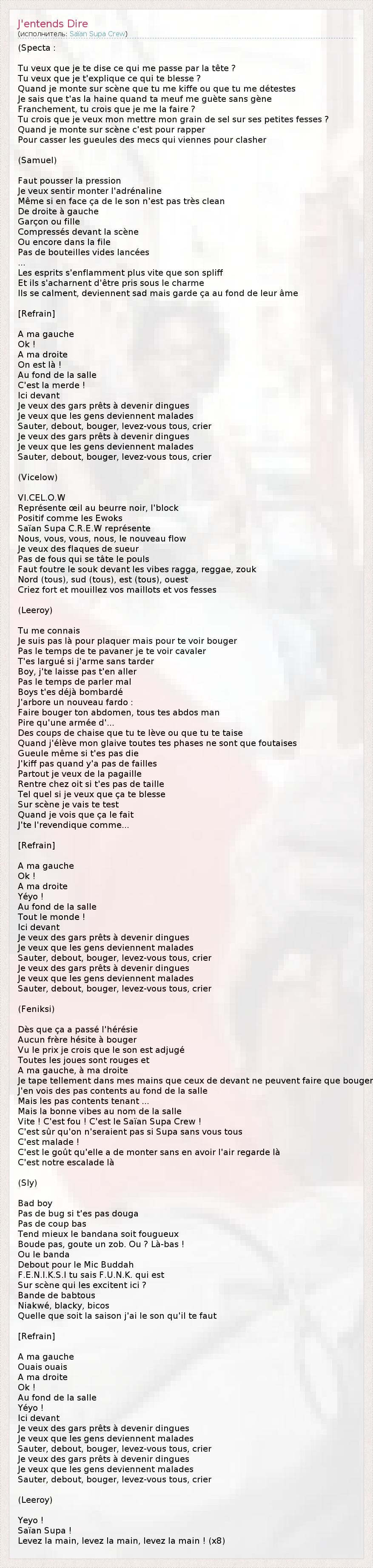 (Specta : Tu veux que je te dise ce qui me passe par la tête ? Tu veux que je t'explique ce qui te blesse ? Quand je monte sur scène que tu me kiffe ou que tu me détestes Je sais que t'as la haine quand ta meuf me guète sans gène Franchement, tu crois que je me la faire ? Tu crois que je veux mon mettre mon grain de sel sur ses petites fesses ? Quand je monte sur scène c'est pour rapper Pour casser les gueules des mecs qui viennes pour clasher (Samuel) Faut pousser la pression Je veux sentir monter l'adrénaline Même si en face ça de le son n'est pas très clean De droite à gauche Garçon ou fille Compressés devant la scène Ou encore dans la file Pas de bouteilles vides lancées ... Les esprits s'enflamment plus vite que son spliff Et ils s'acharnent d'être pris sous le charme Ils se calment, deviennent sad mais garde ça au fond de leur âme [Refrain] A ma gauche Ok ! A ma droite On est là ! Au fond de la salle C'est la merde ! Ici devant Je veux des gars prêts à devenir dingues Je veux que les gens deviennent malades Sauter, debout, bouger, levez-vous tous, crier Je veux des gars prêts à devenir dingues Je veux que les gens deviennent malades Sauter, debout, bouger, levez-vous tous, crier (Vicelow) VI.CEL.O.W Représente œil au beurre noir, l'block Positif comme les Ewoks Saïan Supa C.R.E.W représente Nous, vous, vous, nous, le nouveau flow Je veux des flaques de sueur Pas de fous qui se tâte le pouls Faut foutre le souk devant les vibes ragga, reggae, zouk Nord (tous), sud (tous), est (tous), ouest Criez fort et mouillez vos maillots et vos fesses (Leeroy) Tu me connais Je suis pas là pour plaquer mais pour te voir bouger Pas le temps de te pavaner je te voir cavaler T'es largué si j'arme sans tarder Boy, j'te laisse pas t'en aller Pas le temps de parler mal Boys t'es déjà bombardé J'arbore un nouveau fardo : Faire bouger ton abdomen, tous tes abdos man Pire qu'une armée d'... Des coups de chaise que tu te lève ou que tu te taise Quand j'élève mon glaive toutes tes phases ne sont que foutaises Gueule même si t'es pas die J'kiff pas quand y'a pas de failles Partout je veux de la pagaille Rentre chez oit si t'es pas de taille Tel quel si je veux que ça te blesse Sur scène je vais te test Quand je vois que ça le fait J'te l'revendique comme... [Refrain] A ma gauche Ok ! A ma droite Yéyo ! Au fond de la salle Tout le monde ! Ici devant Je veux des gars prêts à devenir dingues Je veux que les gens deviennent malades Sauter, debout, bouger, levez-vous tous, crier Je veux des gars prêts à devenir dingues Je veux que les gens deviennent malades Sauter, debout, bouger, levez-vous tous, crier (Feniksi) Dès que ça a passé l'hérésie Aucun frère hésite à bouger Vu le prix je crois que le son est adjugé Toutes les joues sont rouges et A ma gauche, à ma droite Je tape tellement dans mes mains que ceux de devant ne peuvent faire que bouger J'en vois des pas contents au fond de la salle Mais les pas contents tenant ... Mais la bonne vibes au nom de la salle Vite ! C'est fou ! C'est le Saïan Supa Crew ! C'est sûr qu'on n'seraient pas si Supa sans vous tous C'est malade ! C'est le goût qu'elle a de monter sans en avoir l'air regarde là C'est notre escalade là (Sly) Bad boy Pas de bug si t'es pas douga Pas de coup bas Tend mieux le bandana soit fougueux Boude pas, goute un zob. Ou ? Là-bas ! Ou le banda Debout pour le Mic Buddah F.E.N.I.K.S.I tu sais F.U.N.K. qui est Sur scène qui les excitent ici ? Bande de babtous Niakwé, blacky, bicos Quelle que soit la saison j'ai le son qu'il te faut [Refrain] A ma gauche Ouais ouais A ma droite Ok ! Au fond de la salle Yéyo ! Ici devant Je veux des gars prêts à devenir dingues Je veux que les gens deviennent malades Sauter, debout, bouger, levez-vous tous, crier Je veux des gars prêts à devenir dingues Je veux que les gens deviennent malades Sauter, debout, bouger, levez-vous tous, crier (Leeroy) Yeyo ! Saïan Supa ! Levez la main, levez la main, levez la main ! (x8)