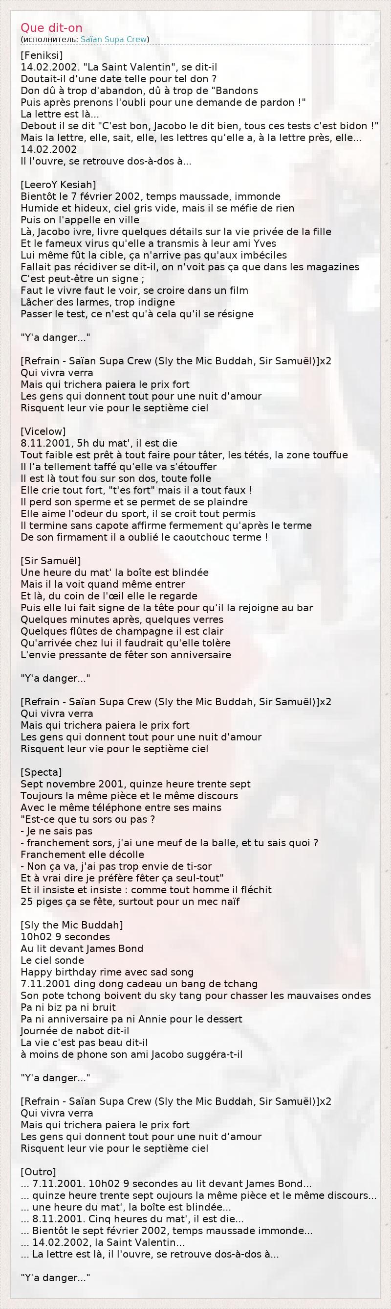 [Feniksi] 14.02.2002. "La Saint Valentin", se dit-il Doutait-il d'une date telle pour tel don ? Don dû à trop d'abandon, dû à trop de "Bandons Puis après prenons l'oubli pour une demande de pardon !" La lettre est là... Debout il se dit "C'est bon, Jacobo le dit bien, tous ces tests c'est bidon !" Mais la lettre, elle, sait, elle, les lettres qu'elle a, à la lettre près, elle... 14.02.2002 Il l'ouvre, se retrouve dos-à-dos à... [LeeroY Kesiah] Bientôt le 7 février 2002, temps maussade, immonde Humide et hideux, ciel gris vide, mais il se méfie de rien Puis on l'appelle en ville Là, Jacobo ivre, livre quelques détails sur la vie privée de la fille Et le fameux virus qu'elle a transmis à leur ami Yves Lui même fût la cible, ça n'arrive pas qu'aux imbéciles Fallait pas récidiver se dit-il, on n'voit pas ça que dans les magazines C'est peut-être un signe ; Faut le vivre faut le voir, se croire dans un film Lâcher des larmes, trop indigne Passer le test, ce n'est qu'à cela qu'il se résigne "Y'a danger..." [Refrain - Saïan Supa Crew (Sly the Mic Buddah, Sir Samuël)]x2 Qui vivra verra Mais qui trichera paiera le prix fort Les gens qui donnent tout pour une nuit d'amour Risquent leur vie pour le septième ciel [Vicelow] 8.11.2001, 5h du mat', il est die Tout faible est prêt à tout faire pour tâter, les tétés, la zone touffue Il l'a tellement taffé qu'elle va s'étouffer Il est là tout fou sur son dos, toute folle Elle crie tout fort, "t'es fort" mais il a tout faux ! Il perd son sperme et se permet de se plaindre Elle aime l'odeur du sport, il se croit tout permis Il termine sans capote affirme fermement qu'après le terme De son firmament il a oublié le caoutchouc terme ! [Sir Samuël] Une heure du mat' la boîte est blindée Mais il la voit quand même entrer Et là, du coin de l'œil elle le regarde Puis elle lui fait signe de la tête pour qu'il la rejoigne au bar Quelques minutes après, quelques verres Quelques flûtes de champagne il est clair Qu'arrivée chez lui il faudrait qu'elle tolère L'envie pressante de fêter son anniversaire "Y'a danger..." [Refrain - Saïan Supa Crew (Sly the Mic Buddah, Sir Samuël)]x2 Qui vivra verra Mais qui trichera paiera le prix fort Les gens qui donnent tout pour une nuit d'amour Risquent leur vie pour le septième ciel [Specta] Sept novembre 2001, quinze heure trente sept Toujours la même pièce et le même discours Avec le même téléphone entre ses mains "Est-ce que tu sors ou pas ? - Je ne sais pas - franchement sors, j'ai une meuf de la balle, et tu sais quoi ? Franchement elle décolle - Non ça va, j'ai pas trop envie de ti-sor Et à vrai dire je préfère fêter ça seul-tout" Et il insiste et insiste : comme tout homme il fléchit 25 piges ça se fête, surtout pour un mec naïf [Sly the Mic Buddah] 10h02 9 secondes Au lit devant James Bond Le ciel sonde Happy birthday rime avec sad song 7.11.2001 ding dong cadeau un bang de tchang Son pote tchong boivent du sky tang pour chasser les mauvaises ondes Pa ni biz pa ni bruit Pa ni anniversaire pa ni Annie pour le dessert Journée de nabot dit-il La vie c'est pas beau dit-il à moins de phone son ami Jacobo suggéra-t-il "Y'a danger..." [Refrain - Saïan Supa Crew (Sly the Mic Buddah, Sir Samuël)]x2 Qui vivra verra Mais qui trichera paiera le prix fort Les gens qui donnent tout pour une nuit d'amour Risquent leur vie pour le septième ciel [Outro] ... 7.11.2001. 10h02 9 secondes au lit devant James Bond... ... quinze heure trente sept oujours la même pièce et le même discours... ... une heure du mat', la boîte est blindée... ... 8.11.2001. Cinq heures du mat', il est die... ... Bientôt le sept février 2002, temps maussade immonde... ... 14.02.2002, la Saint Valentin... ... La lettre est là, il l'ouvre, se retrouve dos-à-dos à... "Y'a danger..."