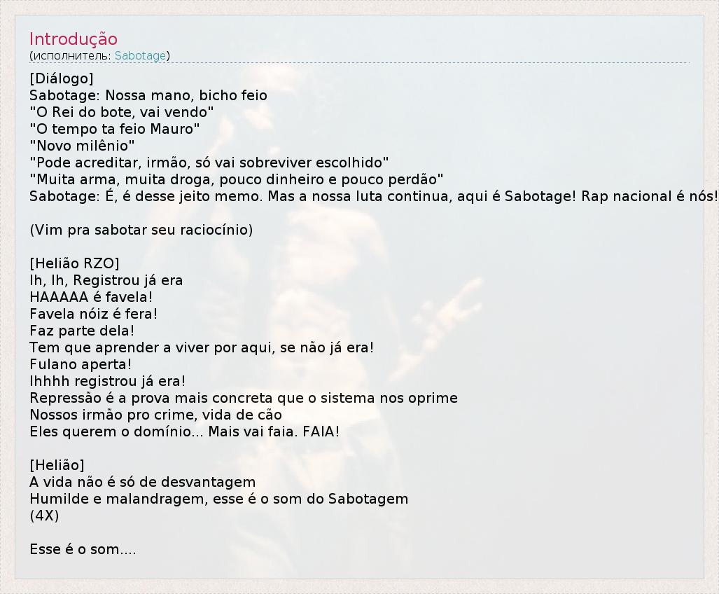 Sabotage: É, é desse jeito memo. Mas a nossa luta continua, aqui é Sabotage! Rap nacional é nós!