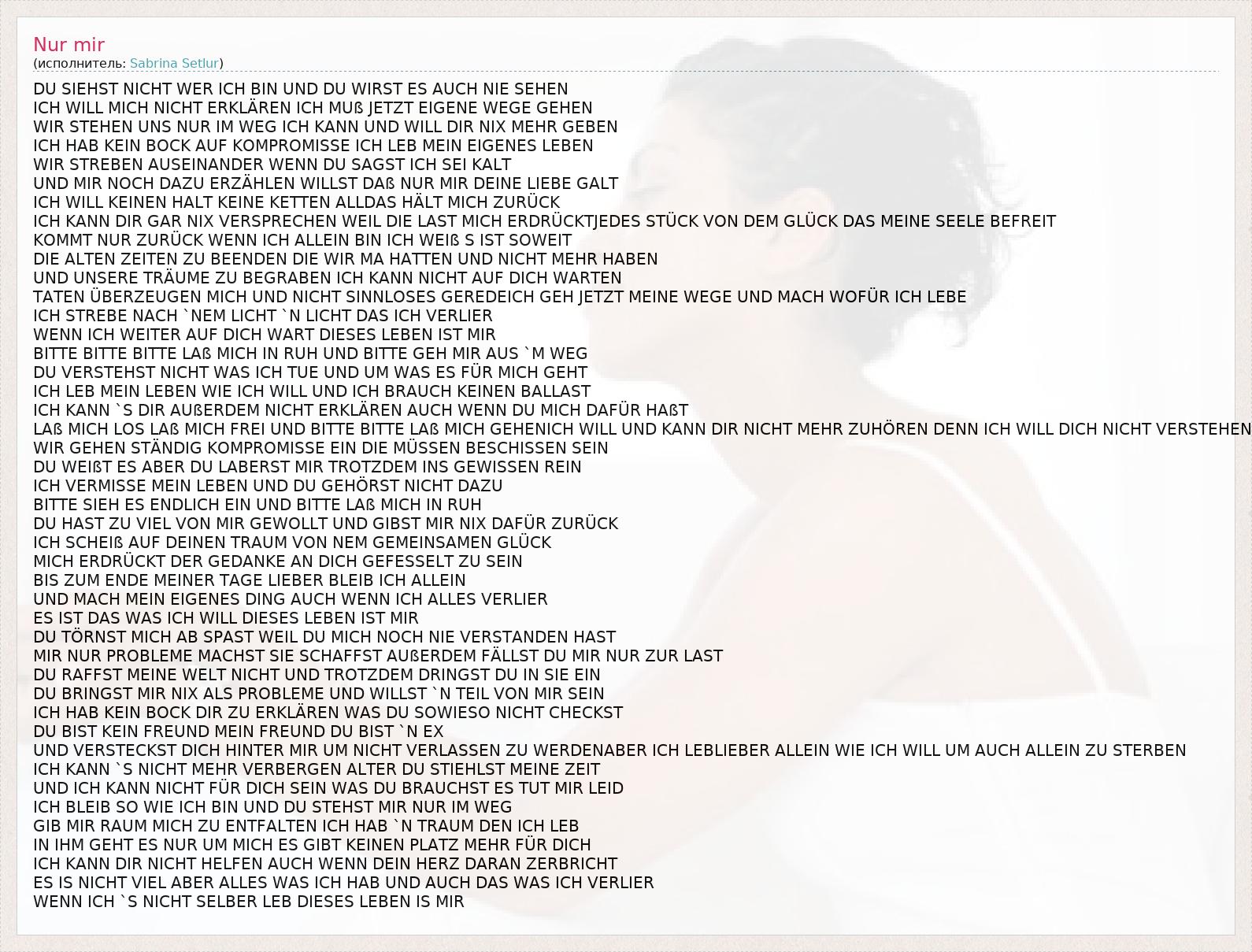 UND VERSTECKST DICH HINTER MIR UM NICHT VERLASSEN ZU WERDENABER ICH LEBLIEBER ALLEIN WIE ICH WILL UM AUCH ALLEIN ZU STERBEN