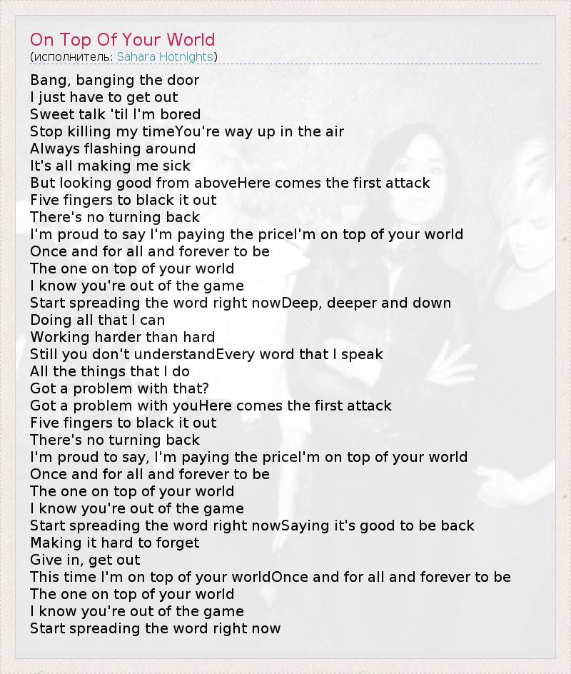 Bang, banging the door I just have to get out Sweet talk 'til I'm bored Stop killing my timeYou're way up in the air Always flashing around It's all making me sick But looking good from aboveHere comes the first attack Five fingers to black it out There's no turning back I'm proud to say I'm paying the priceI'm on top of your world Once and for all and forever to be The one on top of your world I know you're out of the game Start spreading the word right nowDeep, deeper and down Doing all that I can Working harder than hard Still you don't understandEvery word that I speak All the things that I do Got a problem with that? Got a problem with youHere comes the first attack Five fingers to black it out There's no turning back I'm proud to say, I'm paying the priceI'm on top of your world Once and for all and forever to be The one on top of your world I know you're out of the game Start spreading the word right nowSaying it's good to be back Making it hard to forget Give in, get out This time I'm on top of your worldOnce and for all and forever to be The one on top of your world I know you're out of the game Start spreading the word right now