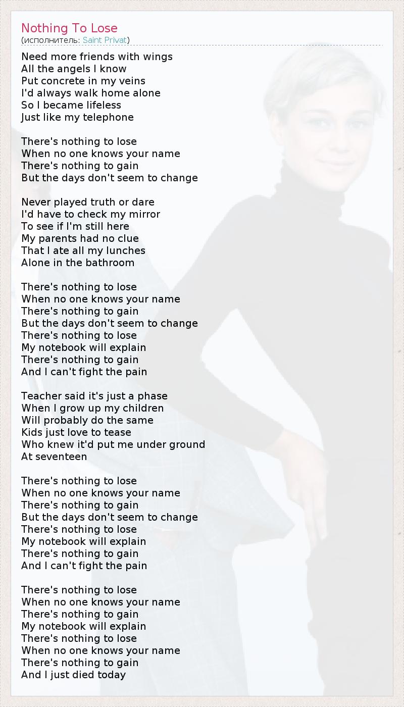 Мне нужно больше крылатых друзей - От тех ангелов, которых я знаю, У меня стынет кровь в венах... Я всегда иду домой один, Ведь я такой безжизненный, Совсем как мой телефон... Тебе нечего терять, Если никто не знает твоего имени. Тебе нечего ловить И, похоже, ничего не меняется... Не принимая правды или вызова, Я должен увидеть своё отражение, Чтобы убедиться, что я ещё здесь. Мои родители не догадываются, Что я ел все свои обеды Один в туалете.... Тебе нечего терять, Если никто не знает твоего имени. Тебе нечего ловить И, похоже, ничего не меняется... Мне нечего терять, Мой блокнот потом всё объяснит. Мне нечего ловить, И я не могу победить эту боль.... Учитель сказал, что это временно, И когда я вырасту, мои дети Будут такими же. Дети просто любят дразниться, Кто знал, что это убьёт меня В семнадцать лет... Тебе нечего терять, Если никто не знает твоего имени. Тебе нечего ловить И, похоже, ничего не меняется... Мне нечего терять, Мой блокнот потом всё объяснит. Мне нечего ловить, И я не могу победить эту боль.... Тебе нечего терять, Если никто не знает твоего имени. Мне нечего ловить, Мой блокнот потом всё объяснит... Тебе нечего терять, Если никто не знает твоего имени. Мне нечего ловить, И сегодня я просто умер...