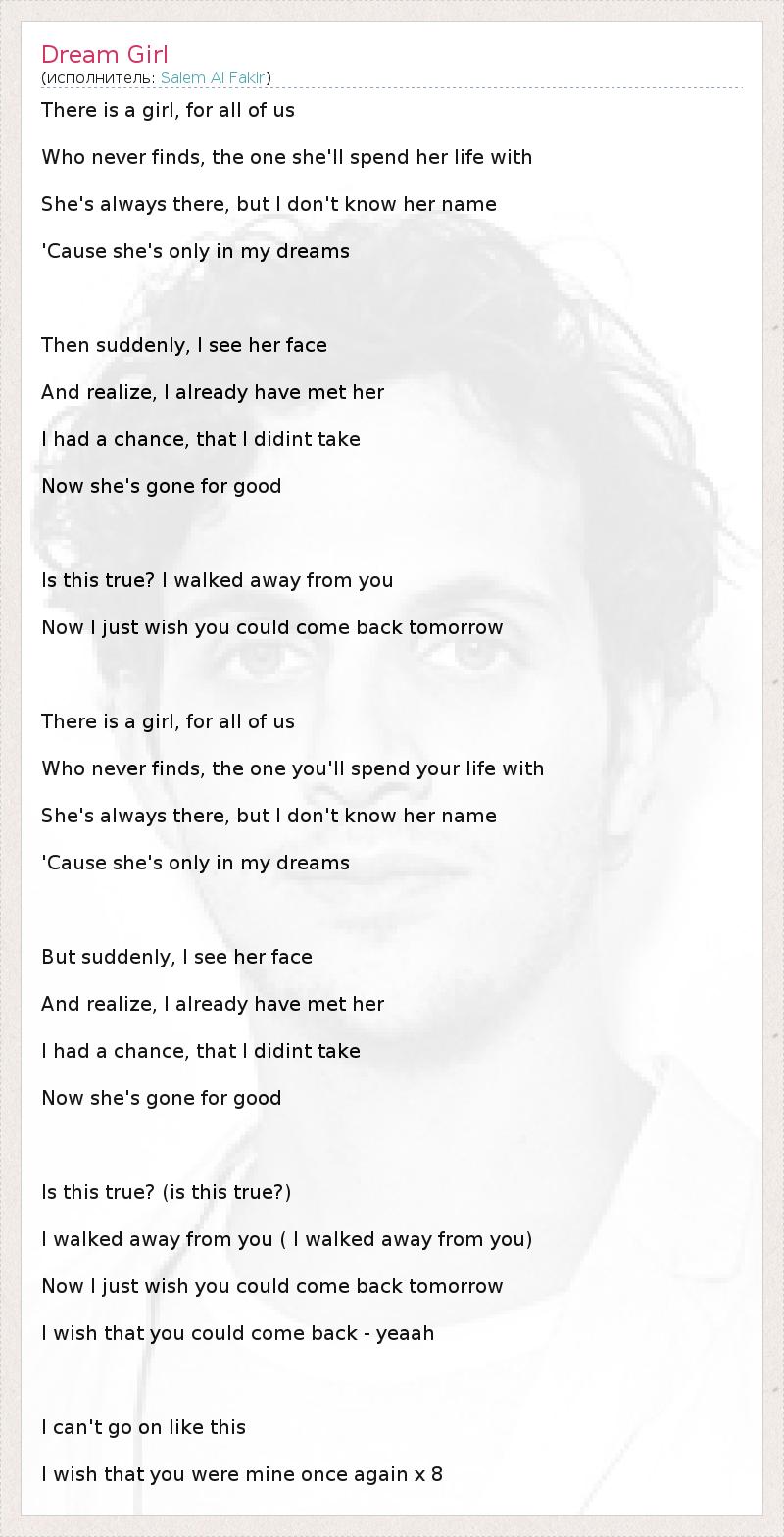 There is a girl, for all of us Who never finds, the one she'll spend her life with She's always there, but I don't know her name 'Cause she's only in my dreams Then suddenly, I see her face And realize, I already have met her I had a chance, that I didint take Now she's gone for good Is this true? I walked away from you Now I just wish you could come back tomorrow There is a girl, for all of us Who never finds, the one you'll spend your life with She's always there, but I don't know her name 'Cause she's only in my dreams But suddenly, I see her face And realize, I already have met her I had a chance, that I didint take Now she's gone for good Is this true? (is this true?) I walked away from you ( I walked away from you) Now I just wish you could come back tomorrow I wish that you could come back - yeaah I can't go on like this I wish that you were mine once again x 8
