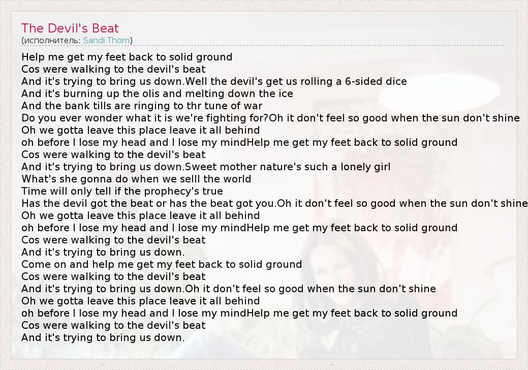 Help me get my feet back to solid ground Cos were walking to the devil's beat And it's trying to bring us down.Well the devil's get us rolling a 6-sided dice And it's burning up the olis and melting down the ice And the bank tills are ringing to thr tune of war Do you ever wonder what it is we're fighting for?Oh it don't feel so good when the sun don't shine Oh we gotta leave this place leave it all behind oh before I lose my head and I lose my mindHelp me get my feet back to solid ground Cos were walking to the devil's beat And it's trying to bring us down.Sweet mother nature's such a lonely girl What's she gonna do when we selll the world Time will only tell if the prophecy's true Has the devil got the beat or has the beat got you.Oh it don't feel so good when the sun don't shine Oh we gotta leave this place leave it all behind oh before I lose my head and I lose my mindHelp me get my feet back to solid ground Cos were walking to the devil's beat And it's trying to bring us down. Come on and help me get my feet back to solid ground Cos were walking to the devil's beat And it's trying to bring us down.Oh it don't feel so good when the sun don't shine Oh we gotta leave this place leave it all behind oh before I lose my head and I lose my mindHelp me get my feet back to solid ground Cos were walking to the devil's beat And it's trying to bring us down.