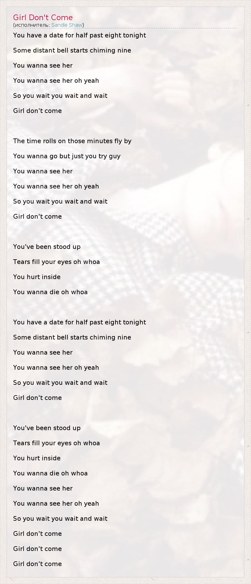 You have a date for half past eight tonight Some distant bell starts chiming nine You wanna see her You wanna see her oh yeah So you wait you wait and wait Girl don't come The time rolls on those minutes fly by You wanna go but just you try guy You wanna see her You wanna see her oh yeah So you wait you wait and wait Girl don't come You've been stood up Tears fill your eyes oh whoa You hurt inside You wanna die oh whoa You have a date for half past eight tonight Some distant bell starts chiming nine You wanna see her You wanna see her oh yeah So you wait you wait and wait Girl don't come You've been stood up Tears fill your eyes oh whoa You hurt inside You wanna die oh whoa You wanna see her You wanna see her oh yeah So you wait you wait and wait Girl don't come Girl don't come Girl don't come