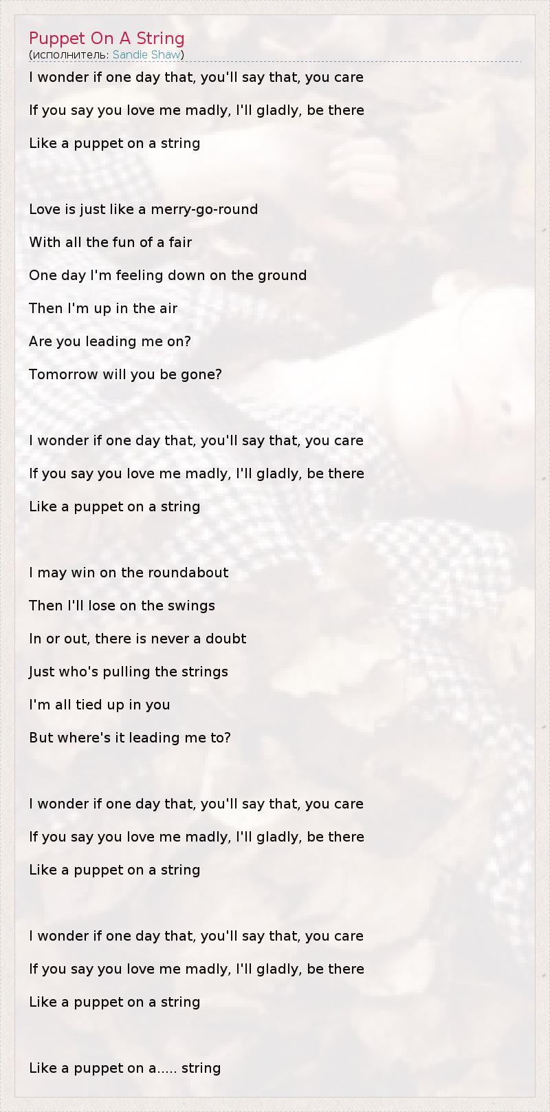 I wonder if one day that, you'll say that, you care If you say you love me madly, I'll gladly, be there Like a puppet on a string Love is just like a merry-go-round With all the fun of a fair One day I'm feeling down on the ground Then I'm up in the air Are you leading me on? Tomorrow will you be gone? I wonder if one day that, you'll say that, you care If you say you love me madly, I'll gladly, be there Like a puppet on a string I may win on the roundabout Then I'll lose on the swings In or out, there is never a doubt Just who's pulling the strings I'm all tied up in you But where's it leading me to? I wonder if one day that, you'll say that, you care If you say you love me madly, I'll gladly, be there Like a puppet on a string I wonder if one day that, you'll say that, you care If you say you love me madly, I'll gladly, be there Like a puppet on a string Like a puppet on a..... string