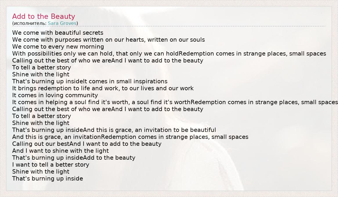 We come with beautiful secrets We come with purposes written on our hearts, written on our souls We come to every new morning With possibilities only we can hold, that only we can holdRedemption comes in strange places, small spaces Calling out the best of who we areAnd I want to add to the beauty To tell a better story Shine with the light That's burning up insideIt comes in small inspirations It brings redemption to life and work, to our lives and our work It comes in loving community It comes in helping a soul find it's worth, a soul find it's worthRedemption comes in strange places, small spaces Calling out the best of who we areAnd I want to add to the beauty To tell a better story Shine with the light That's burning up insideAnd this is grace, an invitation to be beautiful And this is grace, an invitationRedemption comes in strange places, small spaces Calling out our bestAnd I want to add to the beauty And I want to shine with the light That's burning up insideAdd to the beauty I want to tell a better story Shine with the light That's burning up inside