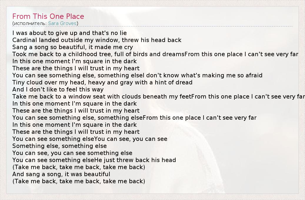 Take me back to a window seat with clouds beneath my feetFrom this one place I can't see very far
